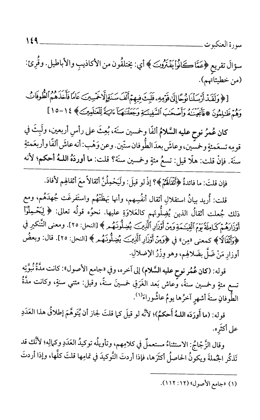 (وَلَقَدْ أَرْسَلْنا نُوحاً إِلى قَوْمِهِ فَلَبِثَ فِيهِمْ أَلْفَ سَنَةٍ إِلاَّ خَمْسِينَ عاماً فَأَخَذَهُمُ الطُّوفانُ وَهُمْ ظالِمُونَ (14) فَأَنْجَيْناهُ وَأَصْحابَ السَّفِينَةِ وَجَعَلْناها آيَةً لِلْعالَمِينَ)] 14 - 15 [