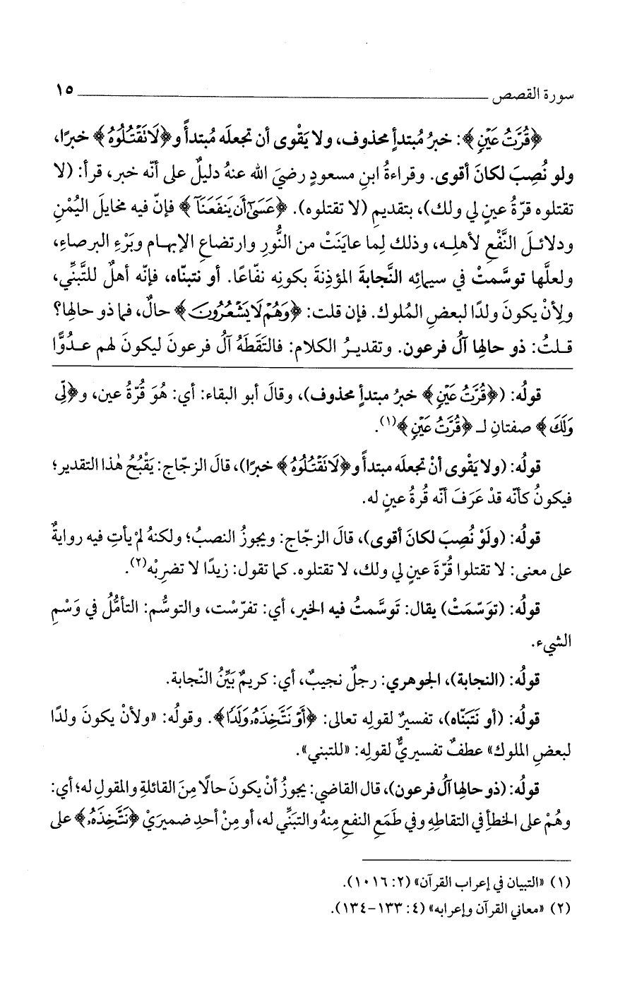 {قُرَّتُ عَيْنٍ}: خبرُ مُبتدأٍ محذوف، ولا يَقْوى أن تجعلَه مُبتدأً و {لاَ تَقْتُلُوهُ} خبرًا، ولو نُصِبَ لكانَ أقوى. وقراءةُ ابنِ مسعودِ رضيَ الله عنه دليلٌ على أنّه خبر، قرأ: (لا تقتلوه قرّةُ عينٍ لي ولك)، بتقديمِ. {لا تقتلوه}. {عَسَى أَن يَنفَعَنَاَ} فإنّ فيه مخايلَ اليُمْنِ ودلائلَ النَّفْعِ لأهلِه، وذلك لِما عايَنَتْ من النُّورِ وارتضاعِ الإبهام وبَرْءِ البرصاءِ، ولعلَّها توسَّمت في سيمائِه النَّجابةَ المؤذِنةَ بكونِه نفّاعًا. أو نتبنّاه، فإنّه أهلٌ للتَّبنِّي، ولِأنْ يكونَ ولدًا لبعضِ المُلوك. فإن قلت: {وَهُمْ لاَ يَشْعُرُونَ} حالٌ، فما ذو حالِها؟