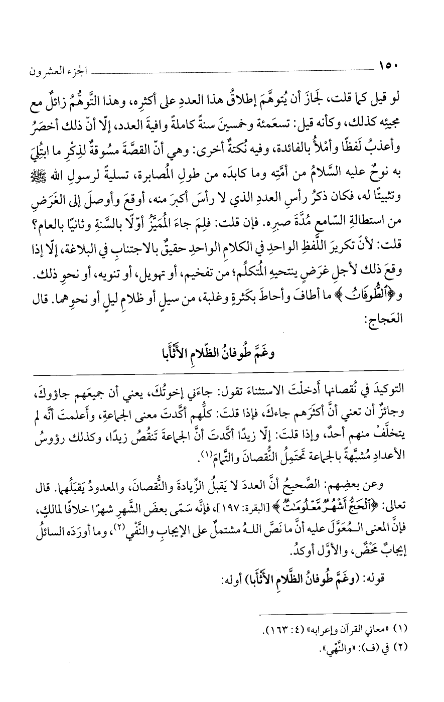 لو قيل كما قلت، لجاز أن يتوهم إطلاق هذا العدد على أكثره، وهذا التوهم زائل مع مجيئه كذلك، وكأنه قيل: تسعمئة وخمسين سنةً كاملةً وافية العدد، إلا أنّ ذلك أخصر وأعذب لفظًا وأملأ بالفائدة، وفيه نكتة أخرى: وهي أنّ القصة مسوقة لذكر ما ابتلى به نوح عليه السلام من أمّته وما كابده من طول المصابرة، تسلية لرسول الله صلى الله عليه وسلم وتثبيتًا له، فكان ذكر رأس العدد الذي لا رأس أكثر منه، أوقع وأوصل إلى الغرض من استطالة السامع مدّة صبره. فإن قلت: فلم جاء المميز أوّلًا بالسنة وثانيًا بالعام؟ قلت: لأنّ تكرير اللفظ الواحد في الكلام الواحد حقيق بالاجتناب في البلاغة، إلا إذا وقع ذلك لأجل غرض ينتحيه المتكلم؛ من تفخيم، أو تهويل، أو تنويه، أو نحو ذلك. و (الطُّوفانُ) ما أطاف وأحاط بكثرةٍ وغلبة، من سيٍل أو ظلام ليٍل أو نحوهما. قال العجاج: