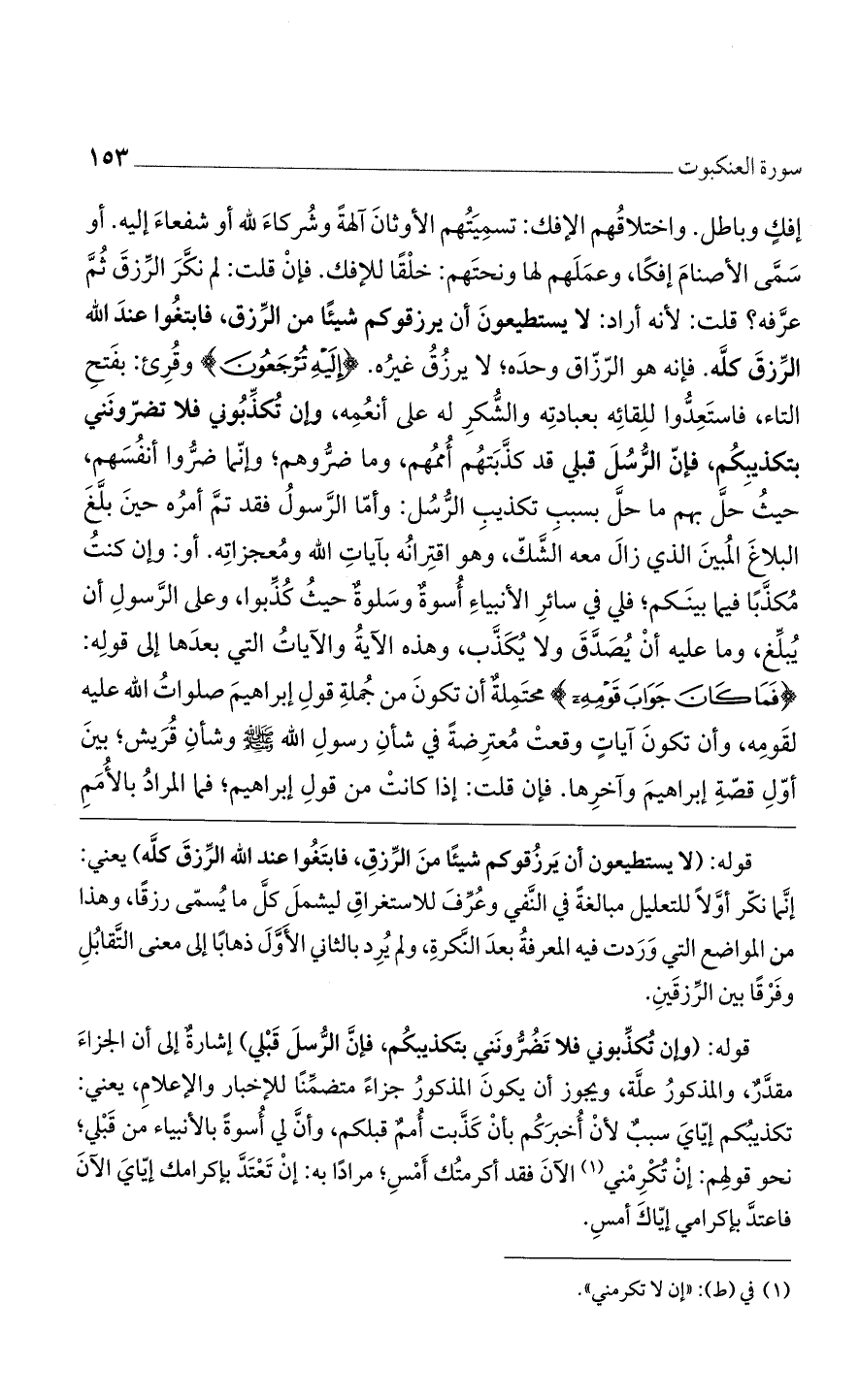 قوله: (لا يستطيعون أن يَرزُقوكم شيئًا منَ الرِّزقِ، فابتَغُوا عند الله الرِّزقَ كلَّه) يعني: إنَّما نكّر أوَّلاً للتعليل مبالغةً في النَّفي وعَرِّفَ للاستغراقِ ليشملَ كلَّ ما يُسمّى رزقًا، وهذا من المواضع التي وَرَدت فيه المعرفةُ بعدَ النَّكرةِ، ولم يُرِد بالثاني الأَوَّلَ ذهابًا إلى معنى التَّقابُلِ وفَرْقًا بين الرِّزقَينِ.