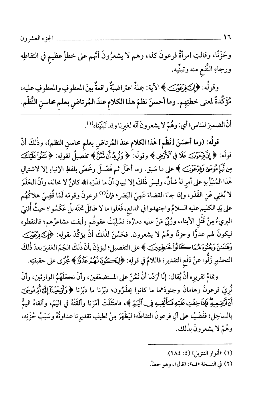 قولُه: (وما أحسَنَ [نَظْم] هذا الكلامِ عندَ المُرتاضِ بعلمِ محاسنِ النظم)، وذلكَ أنّ قولَه: {إنَّ فِرْعَوْنَ عَلاَ فِي اَلْأَرْضِ} وقولَه: {وَنُرِيدُ أَن نَّمُنَّ} تفصيلٌ لقولِه: {نَتْلُوا عَلَيْكَ مِن نَّبَإِ مُوسَى وَفِرْعَوْنَ} على ما سَبق. وما أجمَلَ ثم فَصّلَ وخَصّ بلفظِ الإنباءِ إلا لاشتمالِ هذا المُنبّأِ بهِ لهُ شأنٌ، وليسَ ذلكَ إلا لبيانِ أنّ ما قدّرَه الله كائنٌ لا محالة، وأنّ الحَذَرَ لا يُغنيِ عَنِ القَدَر، وإذا جاءَ القضاءَ عَمِيَ البَصَر؛ فإنّ فرعونَ وقومَه لَمّا قُضِيَ هلاكُهُم على يَدِ الكليمِ عليه السلامُ واجتهدوا في الدفعِ، فَعَلوا ما لا طائلَ تَحتَه بلْ عَكَسُوا؛ حيثُ أُفنِيَ البريءُ مِنْ قَتْلِ الأبناء، ورُبِّيَ مَنْ عليه دمارُه؛ فسُلِبَتْ عقولُهم وأيفت مشاعرُهم؛ فالتقطوه ليكونَ لهم عدوًّا وحزنًا وهُمْ لا يشعرون. فحَسُنَ لذلكَ أنْ يؤكِّدَ بقولِه: {إنَّ فِرْعَوْنَ وَهَامَانَ وجُنُودَهُمَا كَانُوا خَاطِئِينَ} على التفصيل؛ ليؤذِنَ بأنّ ذلكَ الجَمّ الغفيرَ بعدَ ذلكَ التحذيرِ زَلُّوا عن دَفْعِ التقدير؛ فاللامُ في قولهِ: {ليَكُونَ لَهُمْ عَدُوًّا} مُجْرَى على حقيقتِه.