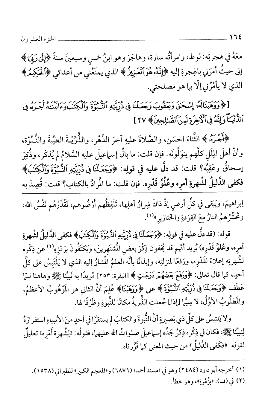 قوله: (قد دلَّ عليه في قولِه: {وَجَعَلْنَا فِي ذُرِّيَّتِهِ النُّبُوَّةَ والْكِتَابَ} فكفى الدَّليلُ لشُهرةِ أمرِه، وعُلوِّ قَدْرِه) يُريد أنَّهم قد يُخففون ذِكْرَ بعضِ المُشتَهِرينَ، ويَكتَفُونَ برَمْزِهِ عن ذِكْره لشُهرتِه إعلاءً لقَدْرِه، ورَفعًا لمنزلتِه، وإيذانًا بأنَّه العلمُ المُشارُ إليه الذي لا يَلْتَبِسُ على كلِّ أحدٍ، كما قال تعالى: {وَرَفَعَ بَعْضَهُمْ دَرَجَاتٍ} [البقرة: 253] مُريدًا به نَبيَّنا صلى الله عليه وسلم وهاهنا لمّا عَطَف {وَجَعَلْنَا فِي ذُرِّيَّتِهِ النُّبُوَّةَ} على {وَوَهَبْنَا} عُلِمَ أنَّ الثاني هو المَوْهُوبُ الأعظمُ، والمَطلُوبُ الأوَّلُ، لا سِيَّما [إذا] جُعلت الذُّريةُ مكانًا للنُّبوةِ وظَرْفًا لها.