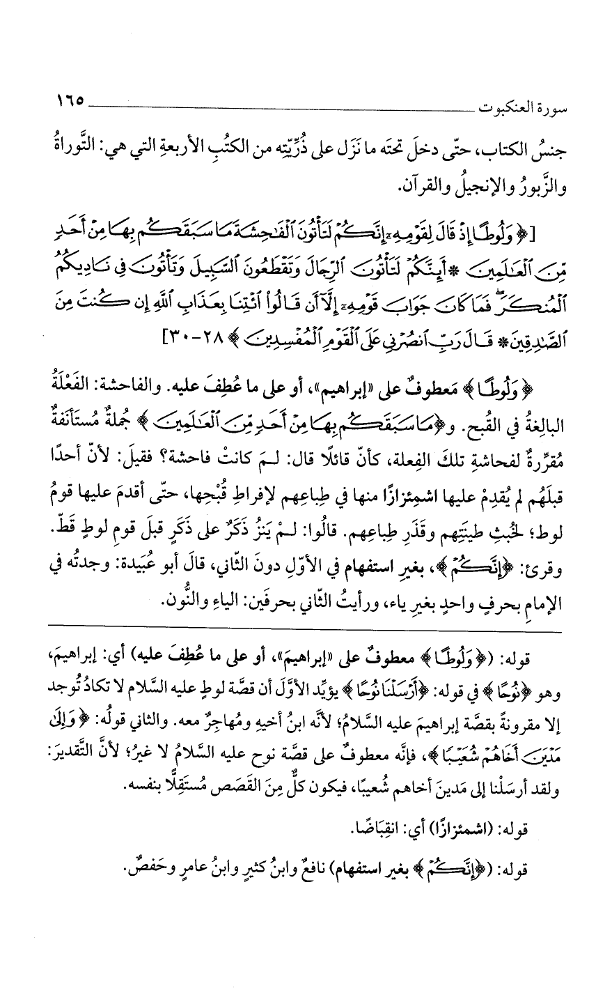 (وَلُوطاً) معطوف على "إبراهيم"، أو على ما عطف عليه. والْفاحِشَة: الفعلة البالغة في القبح. و (ما سَبَقَكُمْ بِها مِنْ أَحَدٍ مِنَ الْعالَمِينَ) جملة مستأنفة مقررة لفحاشة تلك الفعلة، كأن قائلًا قال: لم كانت فاحشة؟ فقيل: لأن أحدا قبلهم لم يقدم عليها اشمئزازًا منها في طباعهم لإفراط قبحها، حتى أقدم عليها قوم لوط؛ لخبث طينتهم وقذر طباعهم. قالوا: لم ينز ذكر على ذكر قبل قوم لوط قط. وقرئ: (إنكم)، بغير استفهام في الأوّل دون الثاني، قال أبو عبيدة: وجدته في الإمام بحرف واحد بغير ياء، ورأيت الثاني بحرفين: الياء والنون.