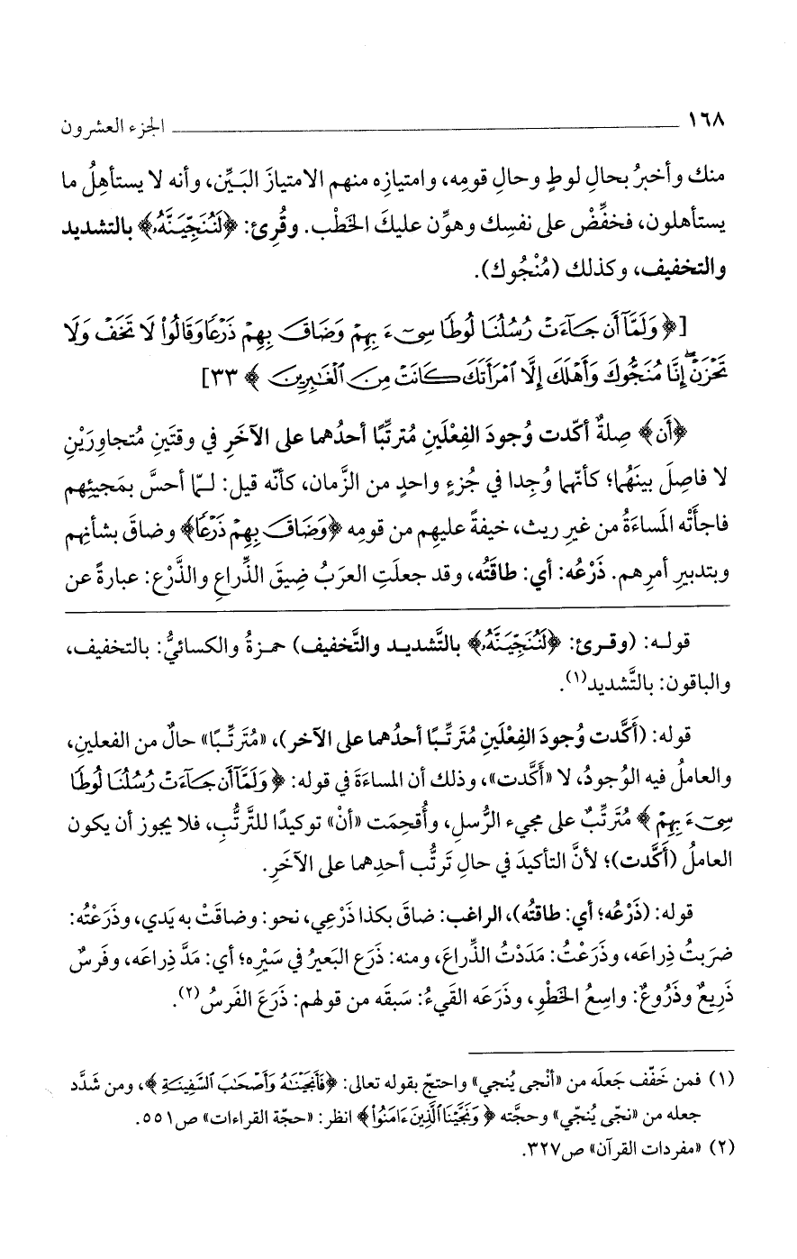 [(وَلَمَّا أَنْ جاءَتْ رُسُلُنا لُوطاً سِيءَ بِهِمْ وَضاقَ بِهِمْ ذَرْعاً وَقالُوا لا تَخَفْ وَلا تَحْزَنْ إِنَّا مُنَجُّوكَ وَأَهْلَكَ إِلاَّ امْرَأَتَكَ كانَتْ مِنَ الْغابِرِينَ)] 33 [