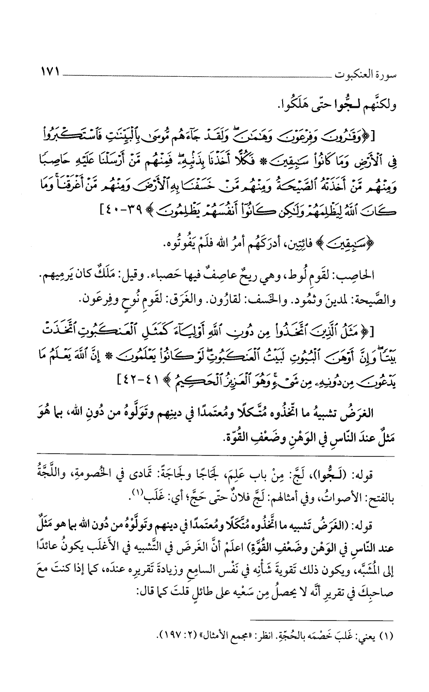 [(وَقارُونَ وَفِرْعَوْنَ وَهامانَ وَلَقَدْ جاءَهُمْ مُوسى بِالْبَيِّناتِ فَاسْتَكْبَرُوا فِي الْأَرْضِ وَما كانُوا سابِقِينَ (39) فَكُلاًّ أَخَذْنا بِذَنْبِهِ فَمِنْهُمْ مَنْ أَرْسَلْنا عَلَيْهِ حاصِباً وَمِنْهُمْ مَنْ أَخَذَتْهُ الصَّيْحَةُ وَمِنْهُمْ مَنْ خَسَفْنا بِهِ الْأَرْضَ وَمِنْهُمْ مَنْ أَغْرَقْنا وَما كانَ الله لِيَظْلِمَهُمْ وَلكِنْ كانُوا أَنْفُسَهُمْ يَظْلِمُونَ)] 39 - 40 [