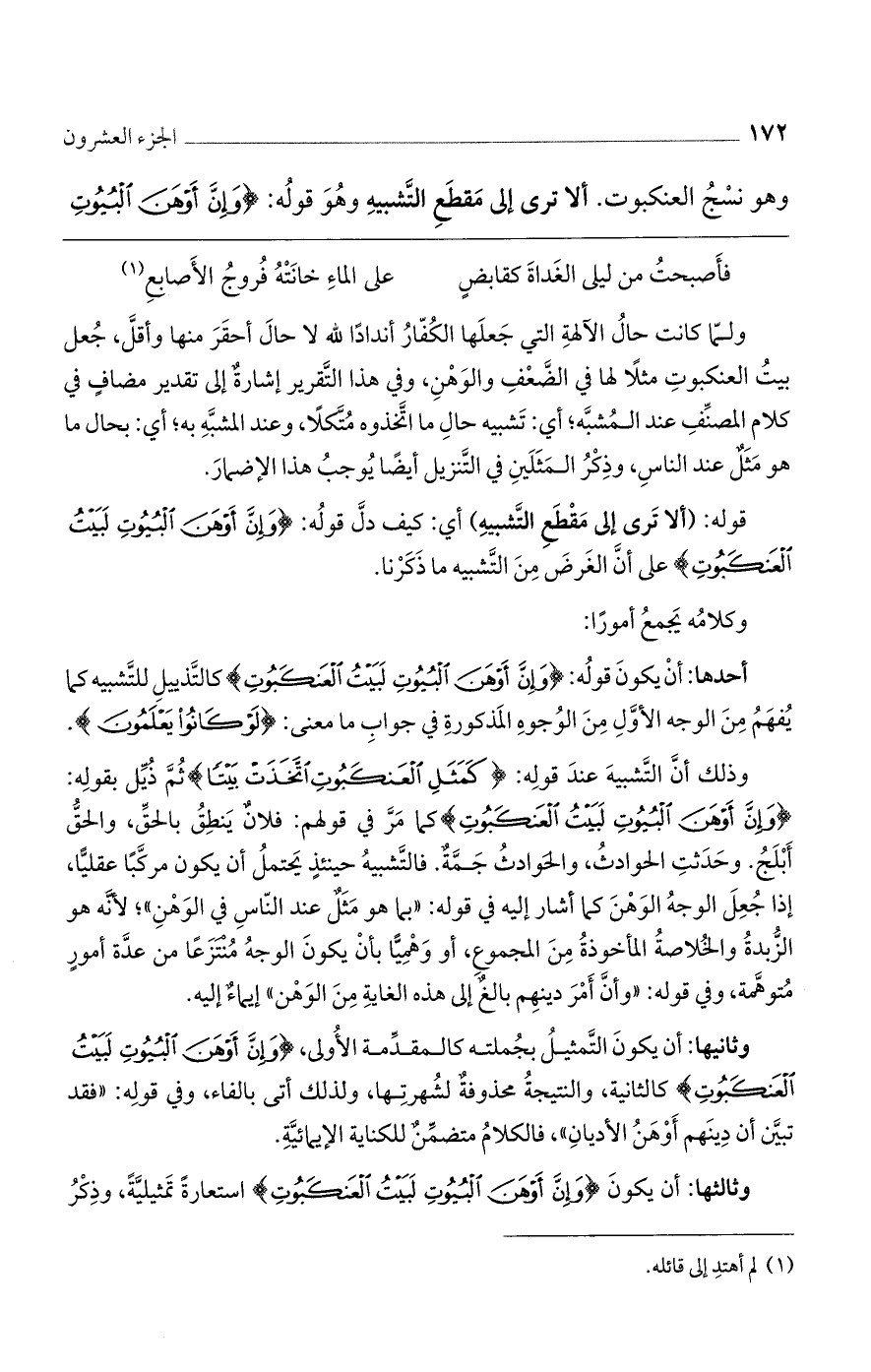 وذلك أنَّ التَّشبيهَ عندَ قولِه: {كَمَثَلِ الْعَنكَبُوتِ اتَّخَذَتْ بَيْتًا} ثُمَّ ذُيِّل بقولِه: {وَإِنَّ أَوْهَنَ الْبُيُوتِ لَبَيْتُ الْعَنكَبُوتِ} كما مَرَّ في قولهم: فلانٌ يَنطِقُ بالحقِّ، والحقُّ أَبْلَجُ. وحَدَثتِ الحوادثُ، والحَوادثُ جَمَّةٌ. فالتَّشبيهُ حينئذٍ يَحتملُ أن يكون مركَّبًا عقليًّا، إذا جُعِلَ الوجهُ الوَهْنَ كما أشار إليه في قوله: ((بما هو مَثَلٌ عند النّاسِ في الوَهْنِ))؛ لأنَّه هو الزُّبدةُ والخُلاصةُ المأخوذةُ مِنَ المجموعِ، أو وَهْمِيًّا بأنْ يكونَ الوجهُ مُنْتَزَعًا من عدَّة أمورٍ مُتوهَّمة، وفي قوله: ((وأنَّ أَمْرَ دينهِم بالغٌ إلى هذه الغايةِ مِنَ الوَهْن)) إيماءٌ إليه.