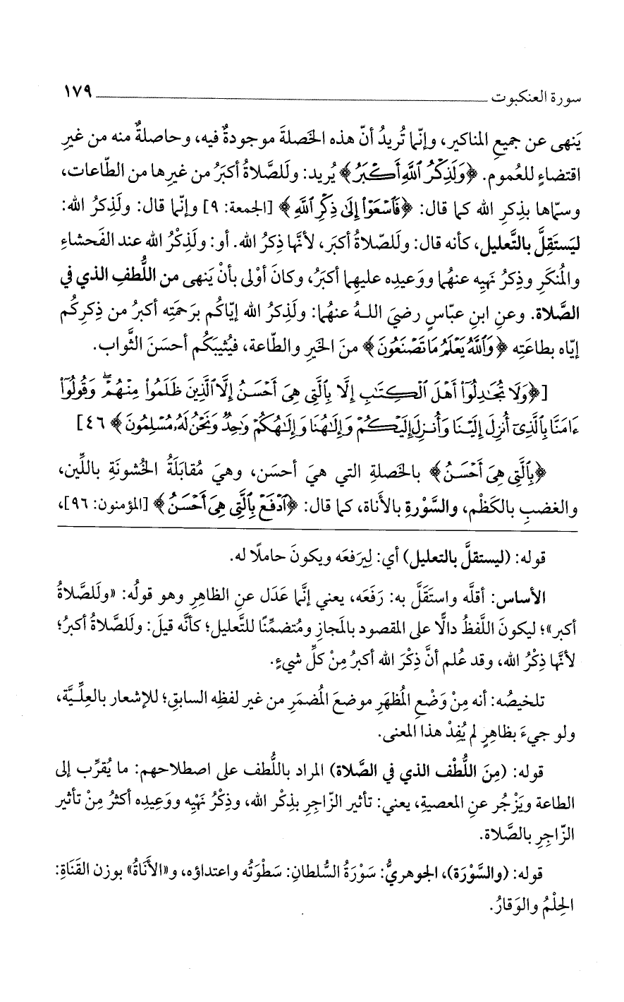 ينهى عن جميع المناكير، وإنما تريد أنّ هذه الخصلة موجودة فيه، وحاصلة منه من غير اقتضاء للعموم. (وَلَذِكْرُ الله أَكْبَرُ) يريد: وللصلاة أكبر من غيرها من الطاعات، وسماها بذكر الله كما قال: (فَاسْعَوْا إِلى ذِكْرِ الله)] الجمعة: 9 [وإنما قال: ولذكر الله: ليستقلّ بالتعليل، كأنه قال:
