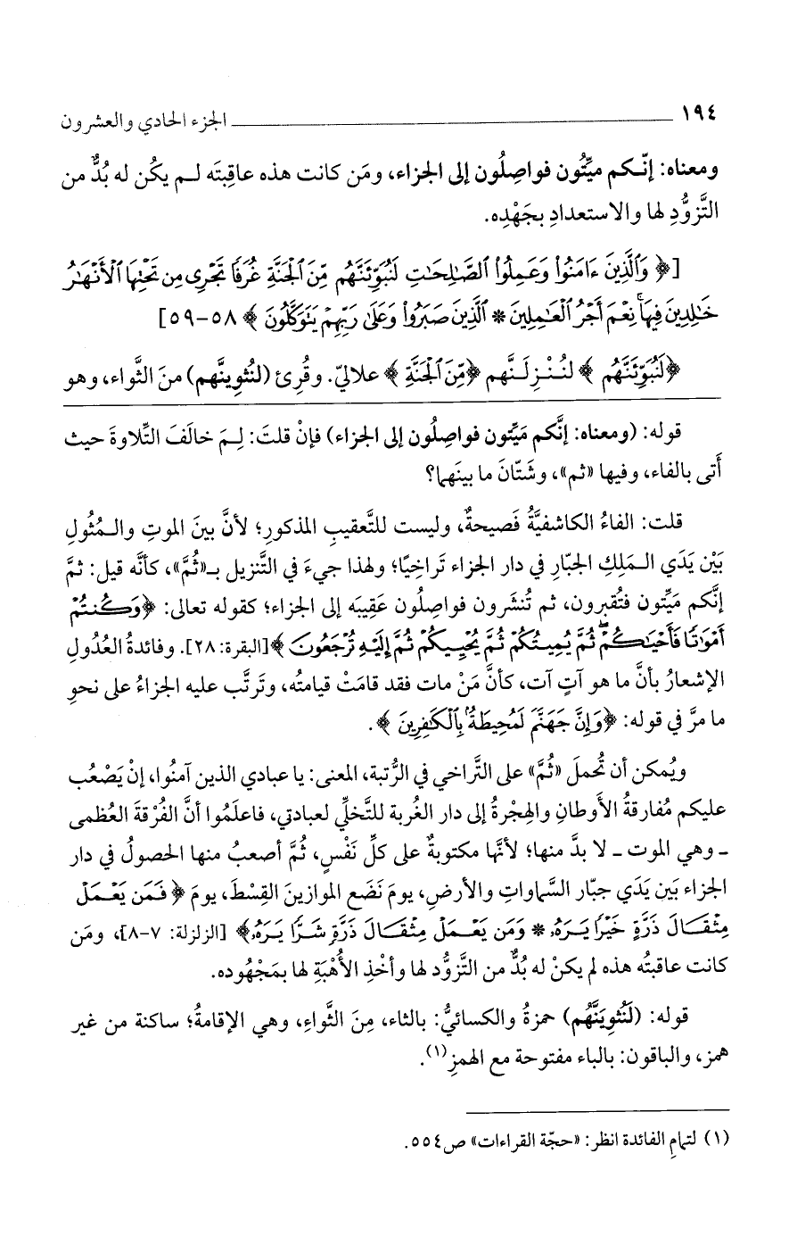 قوله: (لَنُثوِيَنَّهُم) حمزةُ والكسائيُّ: بالثاء، مِنَ الثَّواءِ، وهي الإقامةُ؛ ساكنة من غير همز، والباقون: بالباء مفتوحة مع الهمزِ.