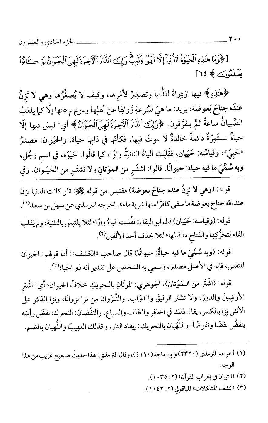 (هذِهِ) فيها ازدراء للدنيا وتصغير لأمرها، وكيف لا يصغرها وهي لا تزن عنده جناح بعوضة، يريد: ما هي لسرعة زوالها عن أهلها وموتهم عنها إلا كما يلعب الصبيان ساعةً ثم يتفرقون. (وَإِنَّ الدَّارَ الْآخِرَةَ لَهِيَ الْحَيَوانُ) أى: ليس فيها إلا حياة مستمرة دائمة خالدة لا موت فيها، فكأنها في ذاتها حياة. والحيوان: مصدر "حي"، وقياسه حييان، فقلبت الياء الثانية واوًا، كما قالوا: حيوة، في اسم رجل، وبه سمى ما فيه حياة: حيوانًا. قالوا: اشتر من الموتان ولا تشتر من الحيوان. وفي
