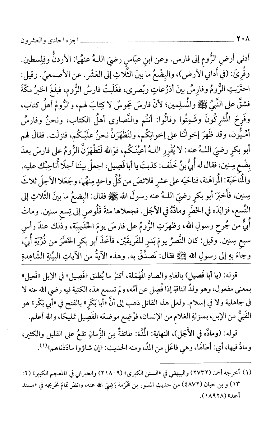 أدنى أرض الروم إلى فارس. وعن ابن عباس رضى الله عنهما: الأردن وفلسطين. وقرئ: (في أدانى الأرض)، والبضع ما بين الثلاث إلى العشر. عن الأصمعى. وقيل: احتربت الروم وفارس بين أذرعات وبصرى، فغلبت فارس الروم، فبلغ الخبر مكة فشق على النبي صلى الله عليه وسلم والمسلمين؛ لأن فارس مجوس لا كتاب لهم، والروم أهل الكتاب، وفرح المشركون وشمتوا وقالوا: أنتم والنصارى أهل الكتاب، ونحن وفارس أميون، وقد ظهر إخواننا على إخوانكم، ولنظهرنّ نحن عليكم، فنزلت. فقال لهم أبو بكر رضى الله عنه: لا يقرّر الله أعينكم، فو الله لتظهرنّ الروم على فارس بعد بضع سنين، فقال له أبى بن خلف: كذبت يا أبا فصيل، اجعل بيننا أجلًا أنا حبك عليه. والمناحبة: المراهنة، فناحبه على عشر قلائص من كل واحد منهما، وجعلا الأجل ثلاث سنين، فأخبر أبو بكر رضى الله عنه رسول الله صلى الله عليه وسلم فقال: البضع ما بين الثلاث إلى التسع، فزايده في الخطر ومادّه في الأجل. فجعلاها مائة قلوٍص إلى تسع سنين. ومات أبىّ من جرح رسول الله، وظهرت الروم على فارس يوم الحديبية، وذلك عند رأس سبع سنين. وقيل: كان النصر يوم بدر للفريقين، فأخذ أبو بكر الخطر من ذرية أبى، وجاء به إلى رسول الله صلى الله عليه وسلم فقال: تصدّق به. وهذه الآية من الآيات البينة الشاهدة