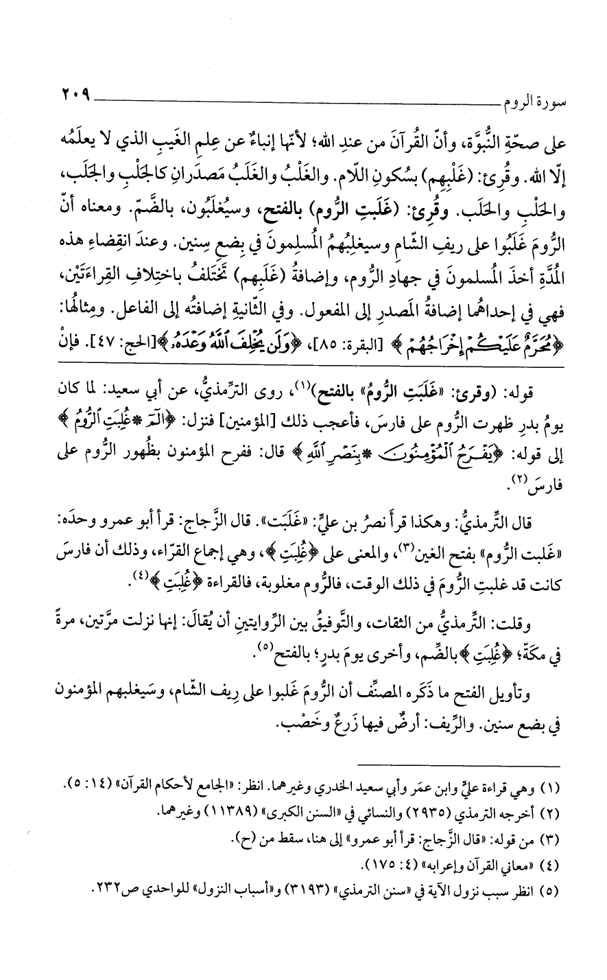 قال التَّرمذيُّ: وهكذا قرأَ نصرُ بن عليٍّ: ((غَلَبَت)). قال الزَّجاج: قرأ أبو عمرو وحدَه: ((غَلبت الرُّوم)) بفتح الغين، والمعنى على {غُلِبَتِ}، وهي إجماع القرّاء، وذلك أن فارسَ كانت قد غلبتِ الرُّومَ في ذلك الوقت، فالرُّوم مغلوبة، فالقراءة {غُلِبَتِ}.
