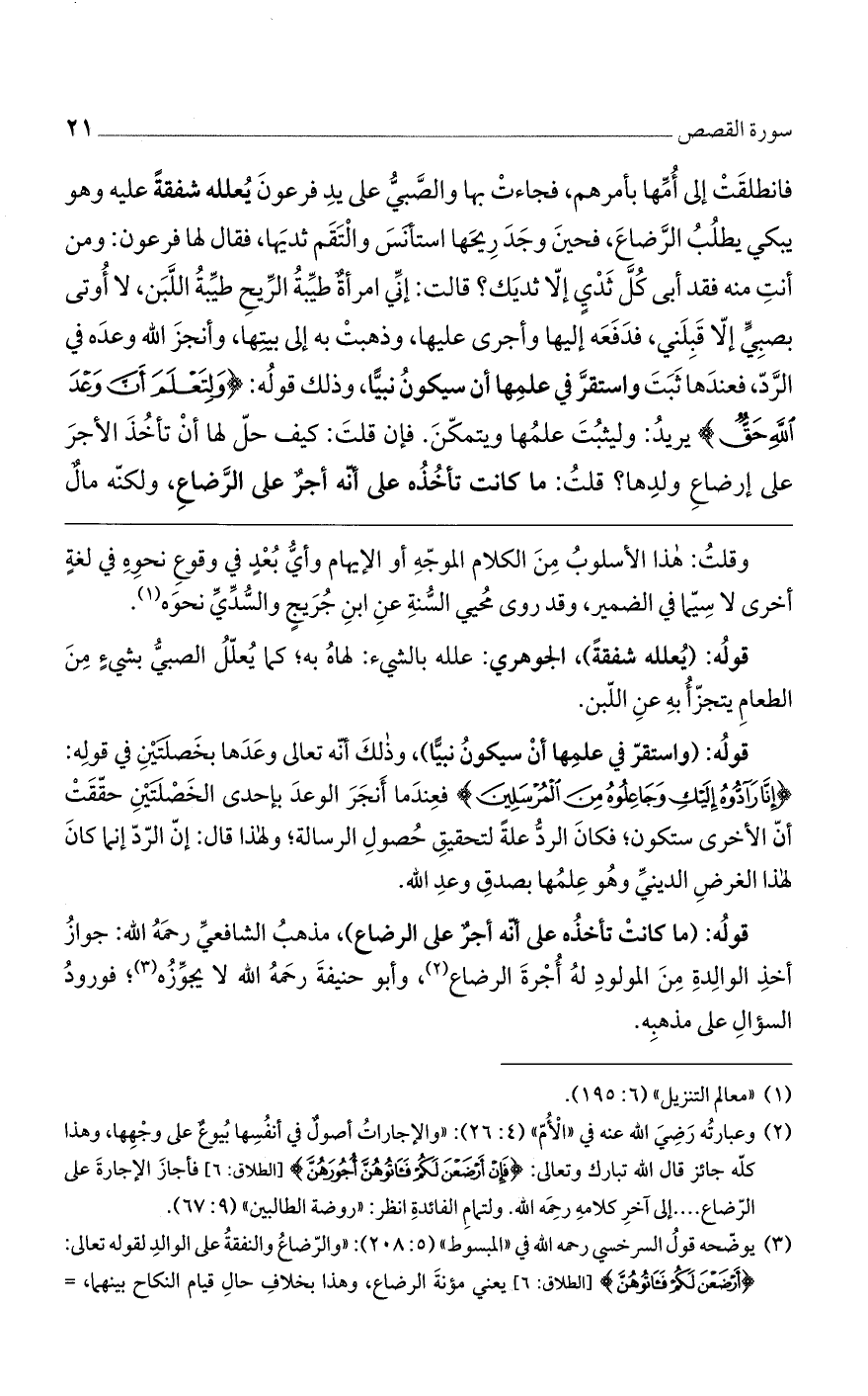 فانطلقَت إلى أُمِّها بأمرهم، فجاءتْ بها والصَّبيُّ على يدِ فرعونَ يُعلله شفقةً عليه وهو يبكي يطلُبُ الرَّضاعَ، فحينَ وجَدَ رِيحَها استأنَسَ والْتَقَم ثديَها، فقال لها فرعون: ومن أنتِ منه فقد أبي كُلَّ ثَدْيٍ إلاّ ثديَك؟ قالت: إنِّي امرأةٌ طيِّبةُ الرِّيحِ طيِّيةُ اللَّبَن، لا أُوتي بصبِيٍّ إلاّ قَبِلَني، فدَفَعَه إليها وأجرى عليها، وذهبتْ به إلى بيتِها، وأنجزَ الله وعدَه في الرَّدّ، فعندَها ثَبَتَ واستقرَّ في علمِها أن سيكونُ نبيًّا، وذلك قولُه: {وَلِتَعْلَمَ أَنَّ وَعْدَ اللهِ حَقٌّ} يريدُ: وليثُبتُ علمُها ويتمكّنَ. فإن قلتَ: كيف حلّ لها أنْ تأخُذَ الأجرَ على إرضاعِ ولدِها؟ قلتُ: ما كانت تأخُذُه على أنّه أجرٌ على الرَّضاعِ، ولكنّه مالٌ