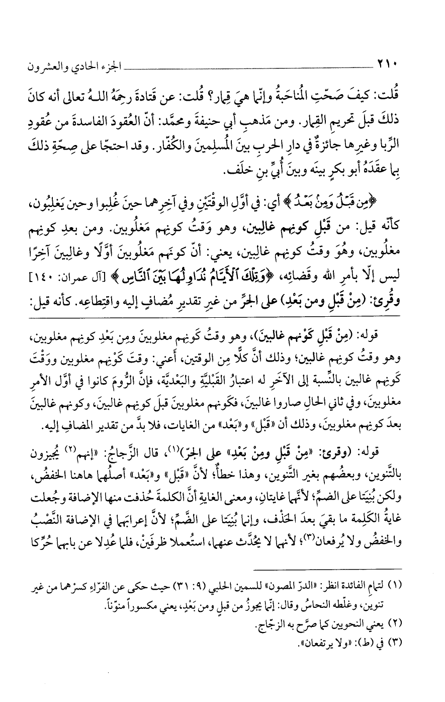 قوله: (مِنْ قَبْلِ كَوْنهم غالبينَ)، وهو وقتُ كَونِهم مغلوبينَ ومِن بَعْدِ كونِهم مغلوبين، وهو وقتُ كونِهم غالبين؛ وذلك أنَّ كلاًّ مِن الوقتين، أَعني: وقتَ كَوْنِهم مغلوبين ووَقْتَ كَونِهم غالبين بالنِّسبة إلى الآخَرِ له اعتبارُ القَبْليَّةِ والبَعْديَّة، فأنَّ الرُّومَ كانوا في أوَّل الأمرِ مغلوبينَ، وفي ثاني الحالِ صاروا غالبينَ، فكَونهم مغلوبينَ قبلَ كونِهم غالبينَ، وكونهم غالبينَ بعدَ كونِهم مغلوبينَ، وذلك أن ((قَبْل)) و ((بَعْد)) من الغايات، فلا بدَّ من تقدير المضافِ إليه.