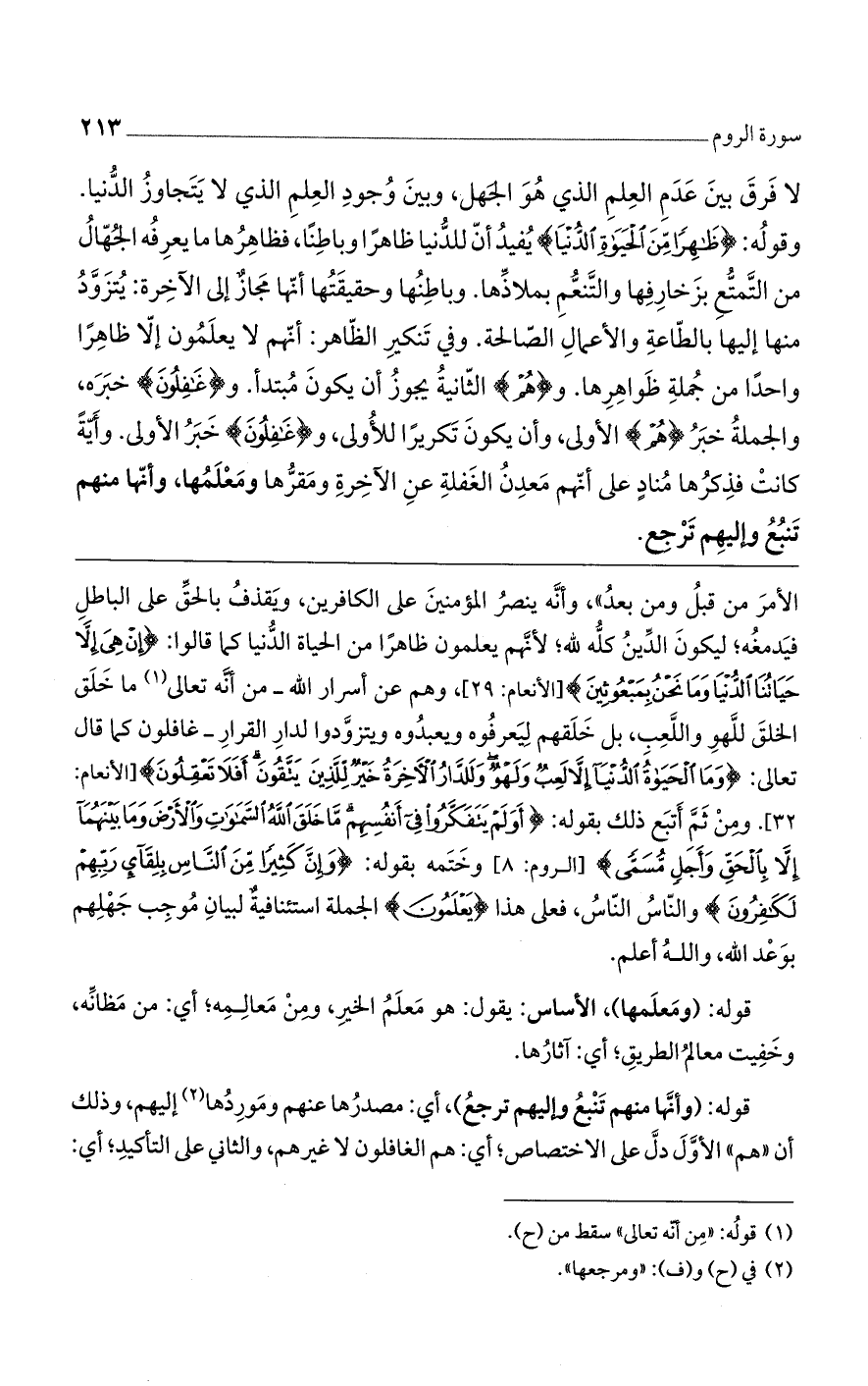 الأمرَ من قبلُ ومن بعدُ))، وأنَّه ينصرُ المؤمنينَ على الكافرين، ويَقذفُ بالحقِّ على الباطلِ فيَدمغُه؛ ليكونَ الدِّينُ كلُّه لله؛ لأنَّهم يعلمون ظاهرًا من الحياة الدُّنيا كما قالوا: {إِنْ هِيَ إِلَّا حَيَاتُنَا الدُّنْيَا وَمَا نَحْنُ بِمَبْعُوثِينَ} [الأنعام: 29]، وهم عن أسرار الله- من أنَّه تعالى ما خَلَق الخلقَ للَّهوِ واللَّعِبِ، بل خَلَقهم لِيَعرفُوه ويعبدُوه ويتزوَّدوا لدارِ القرارِ- غافلون كما قال تعالى: {وَمَا الْحَيَاةُ الدُّنْيَا إِلَّا لَعِبٌ وَلَهْوٌ وَلَلدَّارُ الْآخِرَةُ خَيْرٌ لِّلَّذِينَ يَتَّقُونَ أَفَلَا تَعْقِلُونَ} [الأنعام: 32]. ومِنْ ثَمَّ أَتبَع ذلك بقوله: {أَوَلَمْ يَتَفَكَّرُوا فِي أَنفُسِهِم مَّا خَلَقَ اللَّهُ السَّمَاوَاتِ وَالْأَرْضَ وَمَا بَيْنَهُمَا إِلَّا بِالْحَقِّ وَأَجَلٍ مُّسَمًّى} [الروم: 8] وخَتَمه بقوله: {وَإِنَّ كَثِيرًا مِّنَ النَّاسِ بِلِقَاءِ رَبِّهِمْ لَكَافِرُونَ} والنّاسُ النّاسُ، فعلى هذا {يَعْلَمُونَ} الجملة استئنافيةٌ لبيانِ مُوجِب جَهْلِهم بوَعْد الله، واللهُ أعلم.