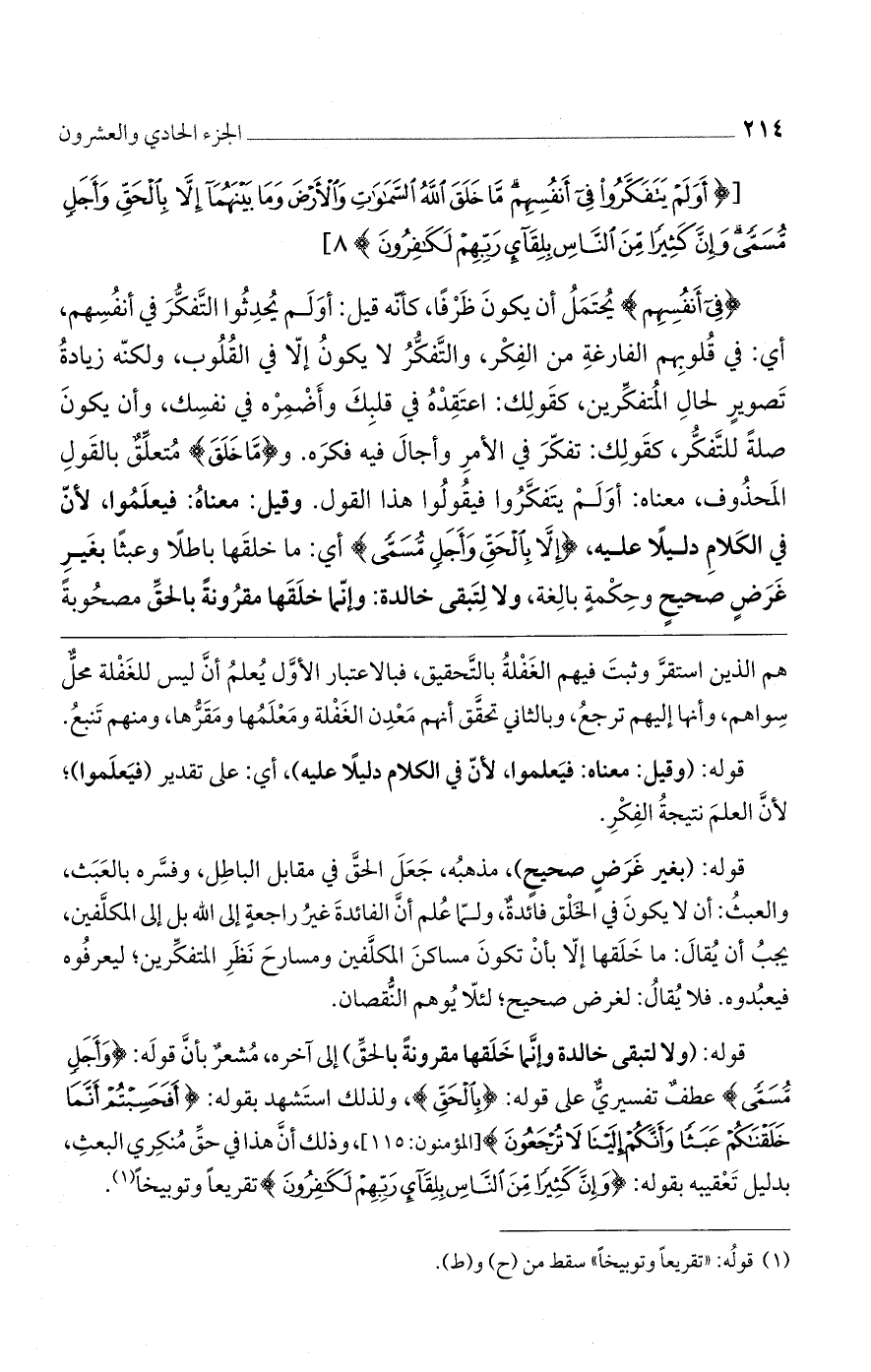 قوله: (ولا لتبقى خالدة وإنَّما خَلَقها مقرونةً بالحقِّ) إلى آخره، مَشعرٌ بأنَّ قولَه: {وَأَجَلٍ مُّسَمًّى} عطفٌ تفسيريٌّ على قوله: {بِالحَقِّ}، ولذلك استَشهد بقوله: {أَفَحَسِبْتُمْ أَنَّمَا خَلَقْنَاكُمْ عَبَثًا وَأَنَّكُمْ إِلَيْنَا لَا تُرْجَعُونَ} [المؤمنون: 115]، وذلك أنَّ هذا في حقِّ مُنكِري البعثِ، بدليل تَعْقيبه بقوله: {وَإِنَّ كَثِيرًا مِّنَ النَّاسِ بِلِقَاءِ رَبِّهِمْ لَكَافِرُونَ} تقريعًا وتوبيخًا.