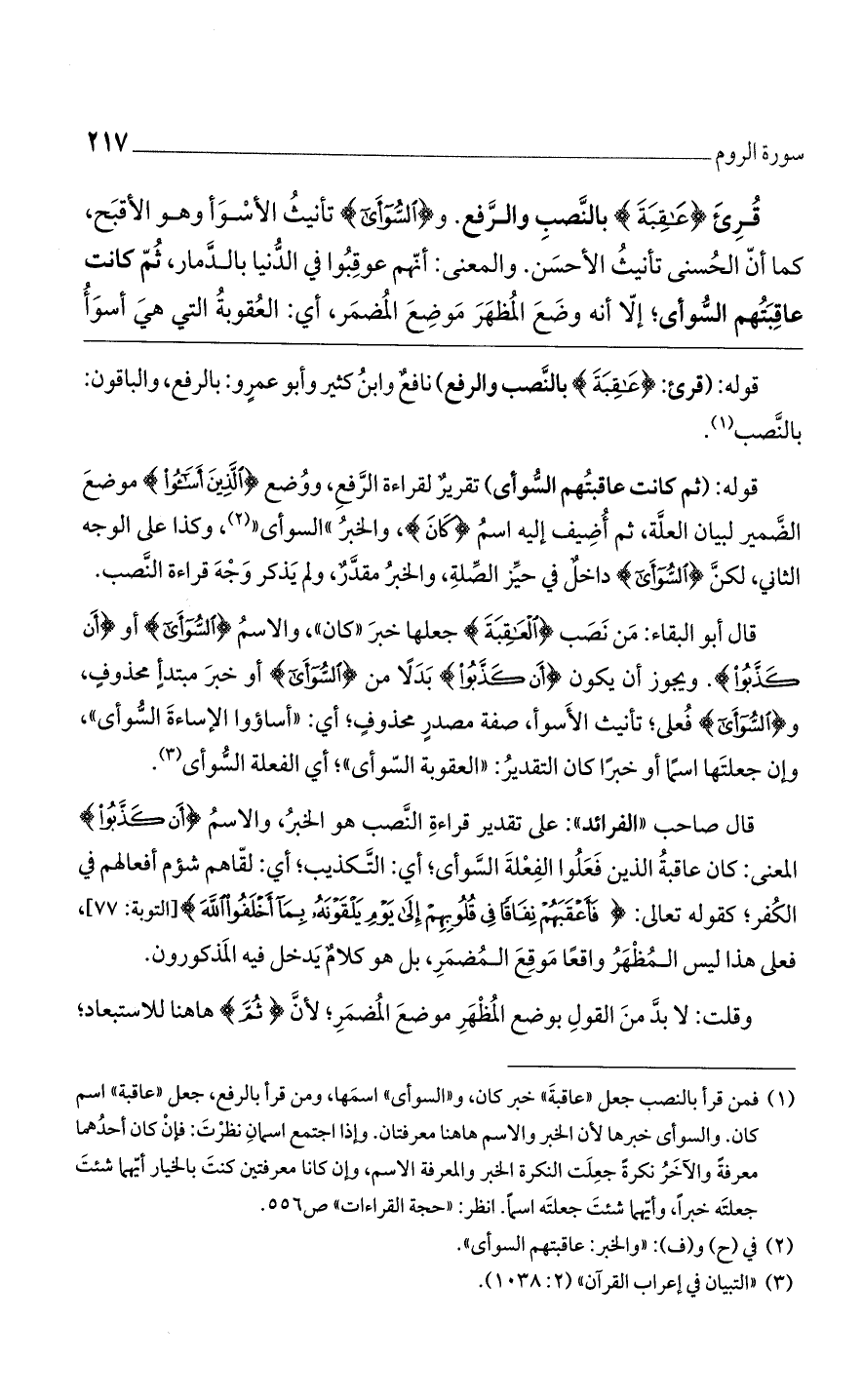 قال أبو البقاء: مَن نَصَب {الْعاقِبَةَ} جعلها خبرَ ((كان))، والاسمُ {السُّوأَى} أو {أَن كَذَّبُوا}. ويجوز أن يكون {أَن كَذَّبُوا} بَدَلاً من {السُّوأَى} أو خبرَ مبتدأٍ محذوفٍ، و {السُّوأَى} فُعلى؛ تأنيث الأَسوأ، صفة مصدرٍ محذوفٍ؛ أي: ((أساؤوا الإساءةَ السُّوأي))، وإن جعلتَها اسمًا أو خبرًا كان التقديرُ: ((العقوبة السّوأي))؛ أي: الفعلة السُّوأي.