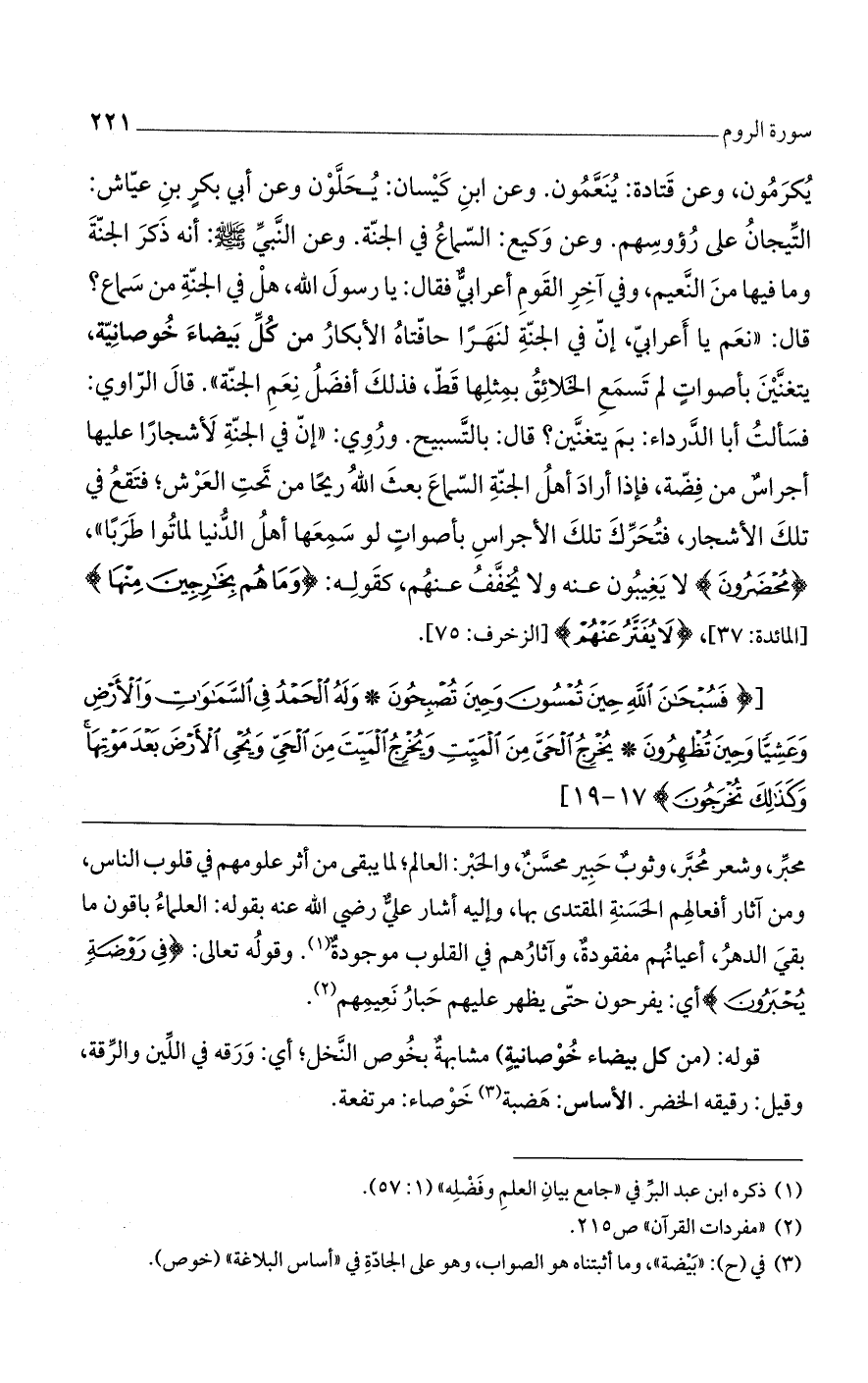 [(فَسُبْحانَ الله حِينَ تُمْسُونَ وَحِينَ تُصْبِحُونَ (17) وَلَهُ الْحَمْدُ فِي السَّماواتِ وَالْأَرْضِ وَعَشِيًّا وَحِينَ تُظْهِرُونَ (18) يُخْرِجُ الْحَيَّ مِنَ الْمَيِّتِ وَيُخْرِجُ الْمَيِّتَ مِنَ الْحَيِّ وَيُحْيِ الْأَرْضَ بَعْدَ مَوْتِها وَكَذلِكَ تُخْرَجُونَ)] 17 - 19 [
