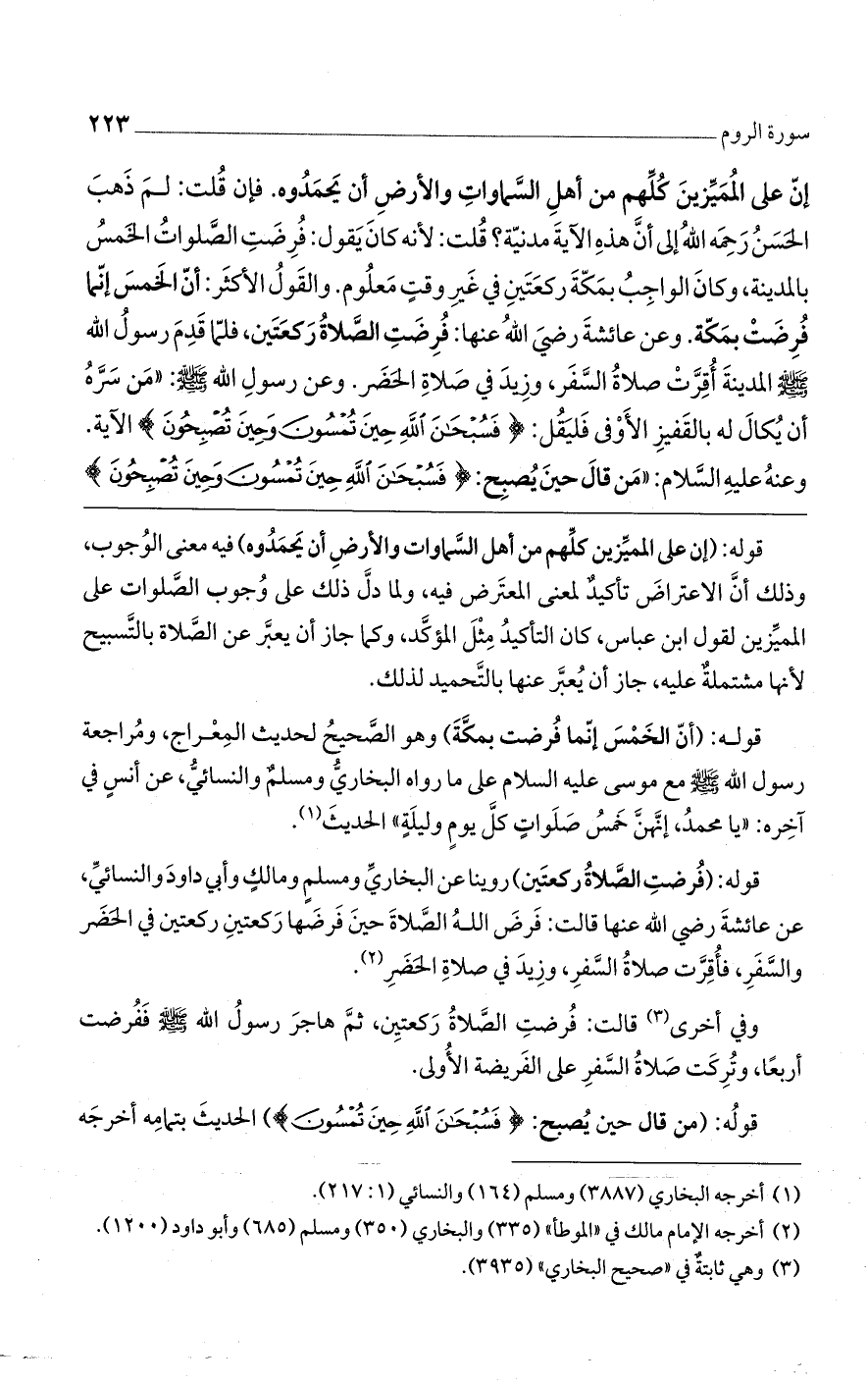 قوله: (فُرضتِ الصَّلاةث ركعتَين) روينا عن البخاريِّ ومسلمٍ ومالكٍ وأبي داودَ والنسائيِّ، عن عائشة رضي الله عنها قالت: فَرضَ اللهُ الصَّلاةَ حينَ فَرضَها رَكعتينِ ركعتين في الحَضَر والسَّفرِ، فأُقِرَّت صلاةُ السَّفرِ، وزِيدَ في صلاةِ الحَضَرِ.