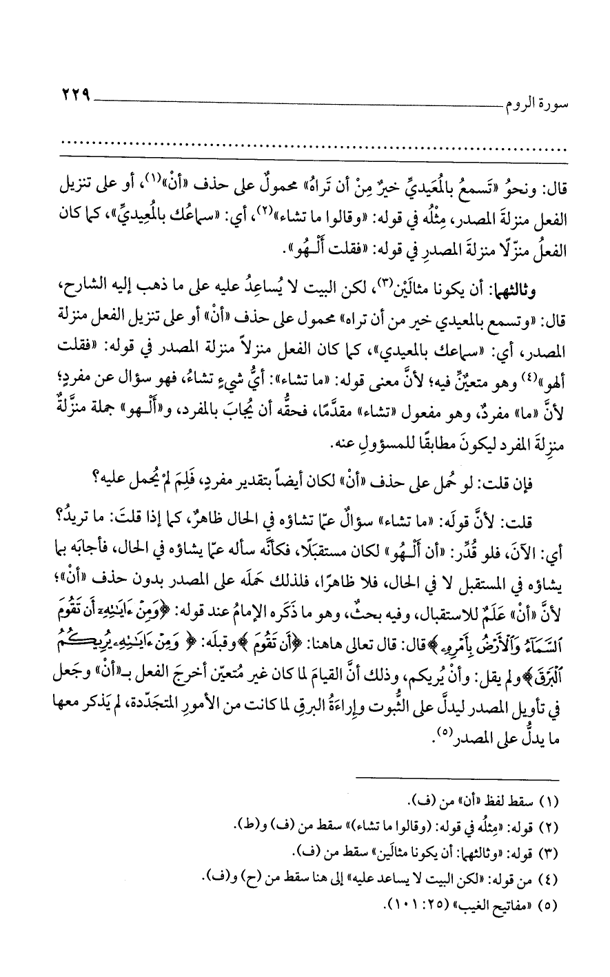 قلت: لأنَّ قولَه: ((ما تشاء)) سؤالٌ عمّا تشاؤه في الحال ظاهرٌ، كما إذا قلتَ: ما تريدُ؟ أي: الآنَ، فلو قُدِّر: ((أن أَلْهُو)) لكان مستقبَلاً، فكأنَّه سأله عمّا يشاؤه في الحال، فأجابَه بما يشاؤه في المستقبل لا في الحال، فلا ظاهرًا، فلذلك حَملَه على المصدر بدون حذف ((أنْ))؛ لأنَّ ((أنْ)) عَلَمٌ للاستقبال، وفيه بحثٌ، وهو ما ذَكَره الإمامُ عند قوله: {وَمِنْ آيَاتِهِ أَن تَقُومَ السَّمَاءُ وَالْأَرْضُ بِأَمْرِهِ} قال: قال تعالى هاهنا: {أَن تَقُومَ} وقبلَه: {وَمِنْ آيَاتِهِ يُرِيكُمُ الْبَرْقَ} ولم يقل: وأنْ يُريكم، وذلك أنَّ القيامَ لما كان غير مُتعيّن أخرجَ الفعل بـ ((أنْ)) وجَعل في تأويل المصدر ليدلَّ على الثُّبوت وإِراءَةُ البرقِ لما كانت من الأمورِ المتجَدّدة، لم يَذكر معها ما يدلُّ على المصدر.