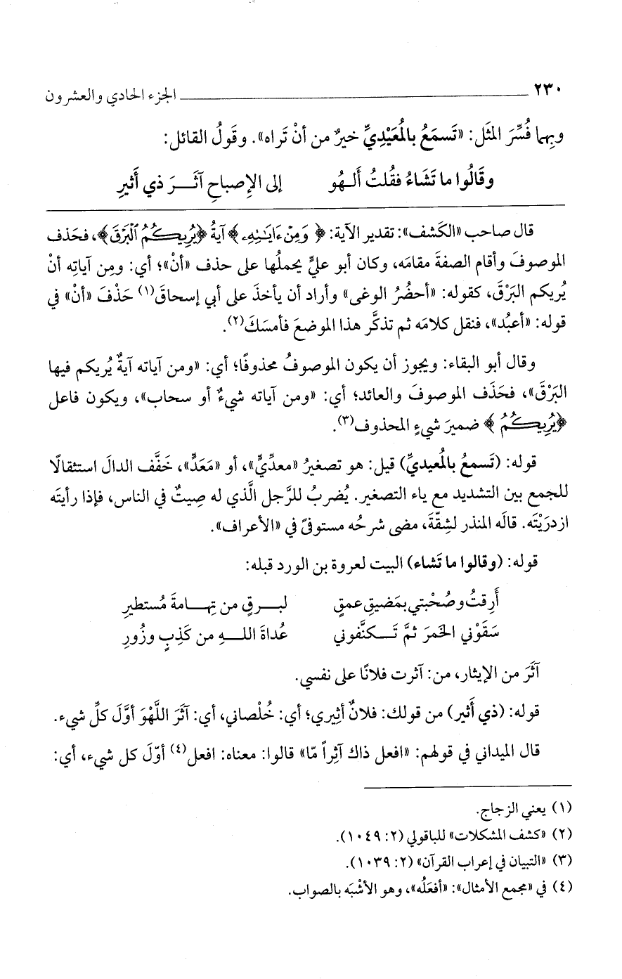 قال صاحب ((الكَشف)): تقدير الآية: {وَمِنْ آيَاتِهِ} آيةُ {يُرِيكُمُ الْبَرْقَ}، فحَذف الموصوفَ وأقام الصفةَ مقامَه، وكان أبو عليٍّ يحملُها على حذف ((أنْ))؛ أي: ومِن آياتِه أنْ يُريكم البَرْقَ، كقوله: ((أحضُرُ الوغي)) وأراد أن يأخذَ على أبي إسحاقَ حَذْفَ ((أنْ)) في قوله: ((أعبُد))، فنقل كلامَه ثم تذكَّر هذا الموضعَ فأمسَكَ.