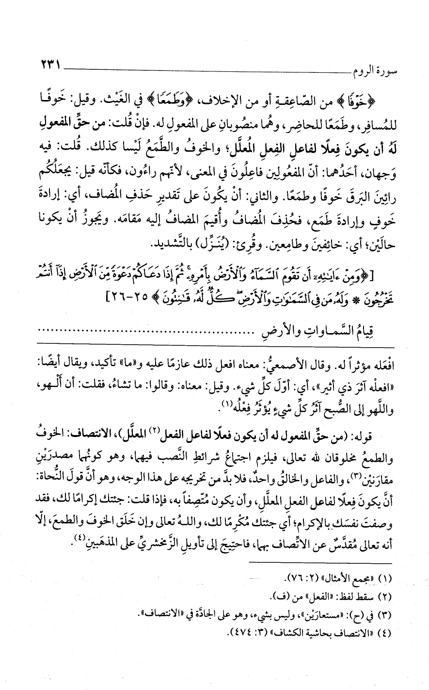 قوله: (من حقِّ المفعول له أن يكون فعلاً لفاعل الفعل المعلَّل)، الانتصاف: الخوفُ والطمعُ مخلوقان لله تعالى، فيلزم اجتماعُ شرائطِ النَّصب فيهما، وهو كونُهما مصدرَيْنِ مقارَنيْن، والفاعل والخالقُ واحدٌ، فلا بدَّ من تخريجه على هذا الوجه، وهو أنَّ قولَ النُّحاة: أنَّ يكونَ فِعلاً لفاعل الفعلِ المعلَّلِ، وأن يكون مُتّصِفًا به، فإذا قلت: جئتك إكرامًا لك، فقد وصفتَ نفسَك بالإكرام؛ أي: جئتك مُكْرِمًا لك، واللهُ تعالى وإن خَلَق الخوفَ والطمعَ، إلاّ أنه تعالى مُقدَّسٌ عن الاتِّصاف بهما، فاحتِيجَ إلى تأويلِ الزَّمخشريِّ على المذهَبينِ.