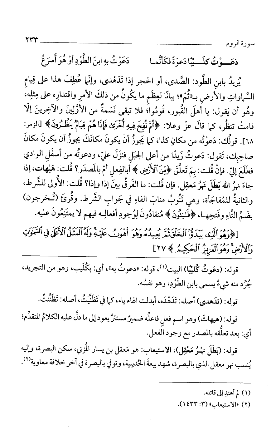 يريد بابن الطود: الصدى، أو الحجر إذا تدهدى، وإنما عطف هذا على قيام السماوات والأرض بـ"ثم"؛ بيانًا لعظم ما يكون من ذلك الأمر واقتداره على مثله، وهو أن يقول: يا أهل القبور، قوموا؛ فلا تبقى نسمة من الأوّلين والآخرين إلا قامت تنظر، كما قال عز وعلا: (ثُمَّ نُفِخَ فِيهِ أُخْرى فَإِذا هُمْ قِيامٌ يَنْظُرُونَ)] الزمر: 68 [. قولك: دعوته من مكان كذا، كما يجوز أن يكون مكانك يجوز أن يكون مكان صاحبك، تقول: دعوت زيدًا من أعلى الجبل فنزل علىّ، ودعوته من أسفل الوادي فطلع إلىّ. فإن قلت: بم تعلق (مِنَ الْأَرْضِ) أبالفعل أم بالمصدر؟ قلت: هيهات، إذا جاء نهر الله بطل نهر معقل. فإن قلت: ما الفرق بين إذا وإذا؟ قلت: الأولى للشرط، والثانية للمفاجأة، وهي تنوب مناب الفاء في جواب الشرط. وقرئ: (تخرجون) بضم التاء وفتحها، (قانِتُونَ) منقادون لوجود أفعاله فيهم لا يمتنعون عليه.