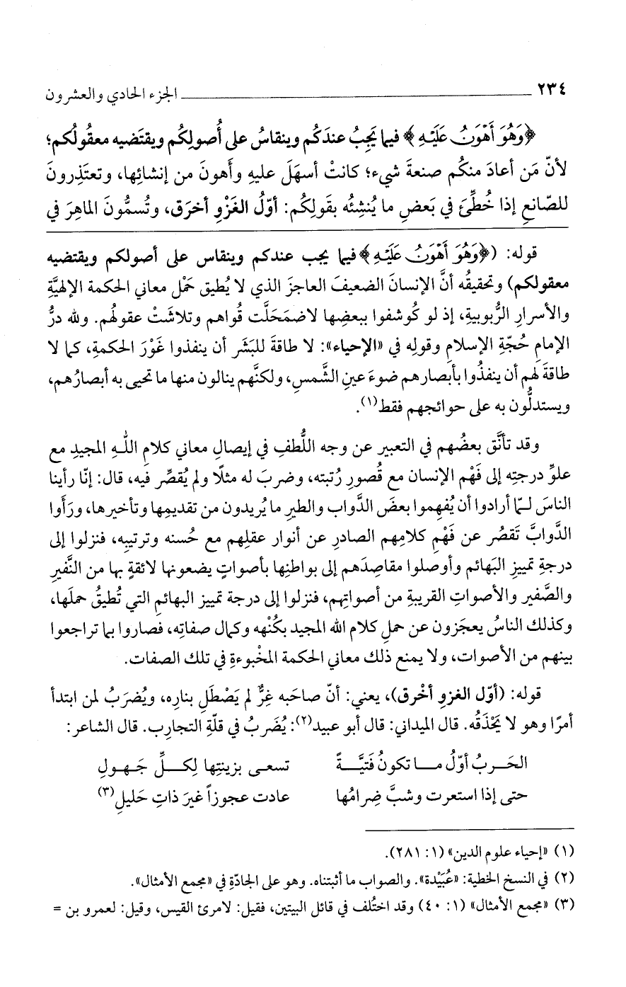 قوله: ({وَهُوَ أَهْوَنُ عَلَيْهِ} فيما يجب عندكم وينقاس على أصولكم ويقتضيه معقولكم) وتحقيقُه أنَّ الإنسانَ الضعيفَ العاجزَ الذي لا يُطيق حَمْل معاني الحكمة الإلهيَّةِ والأسرارِ الرُّبوبيةِ، إذ لو كُوشفوا ببعضِها لاضمَحَلَّت قُواهم وتلاشَتْ عقولُهم. ولله درُّ الإمامِ حُجّةِ الإسلامِ وقولِه في ((الإحياء)): لا طاقةَ للبَشَر أن ينفذوا غَوْرَ الحكمةِ، كما لا طاقةَ لهم أن ينفذُوا بأبصارهم ضوءَ عينِ الشَّمسِ، ولكنَّهم ينالون منها ما تحيي به أبصارُهم، ويستدلُّون بع على حوائجهم فقط.