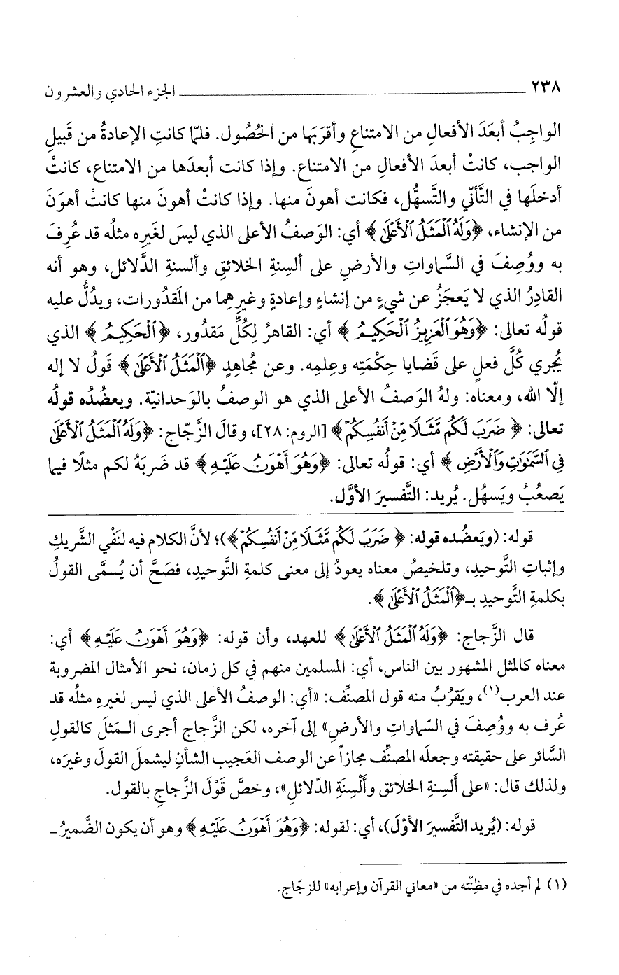 قال الزَّجاج: {وَلَهُ الْمَثَلُ الْأَعْلَى} للعهد، وأن قوله: {وَهُوَ أَهْوَنُ عَلَيْهِ} أي: معناه كالمثل المشهور بين الناس، أي: المسلمين منهم في كل زمان، نحو الأمثال المضروبة عند العرب، ويَقرُبُ منه قول المصنِّف: ((أي: الوصفُ الأعلى الذي ليس لغيرهِ مثلُه قد عُرف به ووُصِفَ في السّماواتِ والأرضِ)) إلى آخره، لكن الزَّجاج أجرى المَثلَ كالقولِ السَّائر على حقيقته وجعلَه المصنِّف مجازًا عن الوصف العَجيب الشأنِ ليشملَ القولَ وغيرَه، ولذلك قال: ((على ألسِنةِ الخلائق وأَلْسِنَةِ الدّلائلِ))، وخصَّ قَوْلَ الزَّجاجِ بالقول.