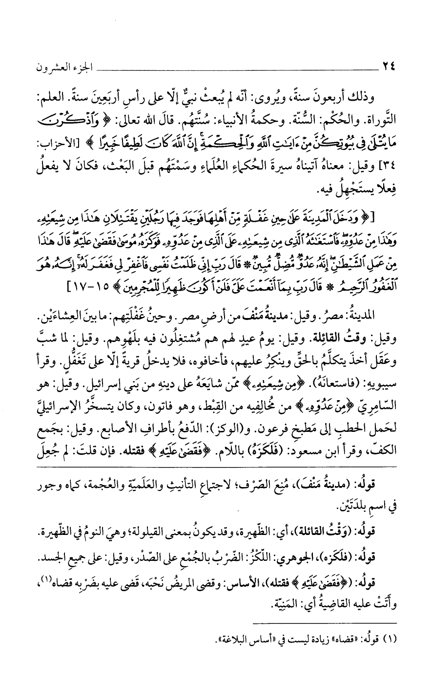 وقيل: وقتُ القائِلة. وقيل: يومُ عيدٍ لهم هم مُشتغِلُون فيه بلَهْوِهم. وقيل: لما شبَّ وعَقَل أخذَ يتكلَّمُ بالحقِّ وينْكِرُ عليهم، فأخافوه، فلا يدخلُ قريةً إلاّ على تَغَفُّلٍ. وقرأ سيبويهِ: (فاستعانَهُ). {مِن شِيعَتِهِ} ممّن شايَعَهُ على دينهِ من بَني إسرائيل. وقيل: هو السّامِرِيّ {مِنْ عَدُوِّهِ} من مُخالِفِيه من القِبْط، وهو فاتون، وكان يتسخَّرُ الإسرائيليَّ لحَمل الحطبِ إلى مَطبخِ فرعون. و (الوكز): الدّفعُ بأطرافِ الأصابع. وقيل: بجَمع الكفّ، وقرأ ابن مسعود: (فَلَكَزَهُ) باللاّم. {فَقَضَى عَلَيْهِ} فقتله. فإن قلتَ: لم جُعِلَ