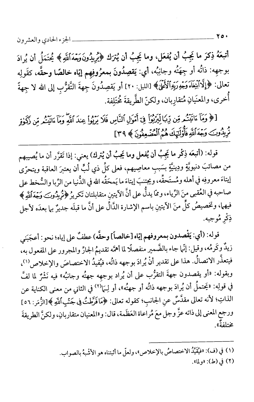 قوله: (أي: يَقْصدون بمعروفهم إيّاه [خالصًا] وحقَّه) عطفٌ على إياه؛ نحو: أعجَبَني زيدٌ وكَرمُه، وقيل: إنّما جاء بالضَّمير منفصلاً لما أهمَّه تقديمُ الجارِّ والمجرور على المفعول به، فيتعذَّر الاتصالُ. هذا على تقدير أنْ يُرادَ بوجهه ذاتُه، فيُفيدُ الاختصاصَ والإخلاص، وبقوله: ((أو يقصدون جهةَ التقرُّب على أن يُراد بوجهِه جهتُه وجانبُه)) فيه نَشْرٌ لما لفَّ في قولِه: ((يَحتملُ أن يُرادَ بوجهه ذاتُه أو جهتُه))، أو لِمَا في الثاني من معنى الكناية عن الذاتِ؛ لأنه تعالى مقدَّسٌ عنِ الجانبِ؛ كقوله تعالى: {مَا فَرَّطتُ فِي جَنبِ اللَّهِ} [الزُّمَر: 56] ورجع المعنى إلى ذاته عزَّ وجل معَ مُراعاة العَظَمة، قال: و ((المعنيان متقاربانِ، ولكنَّ الطريقةَ مختلفةٌ)).