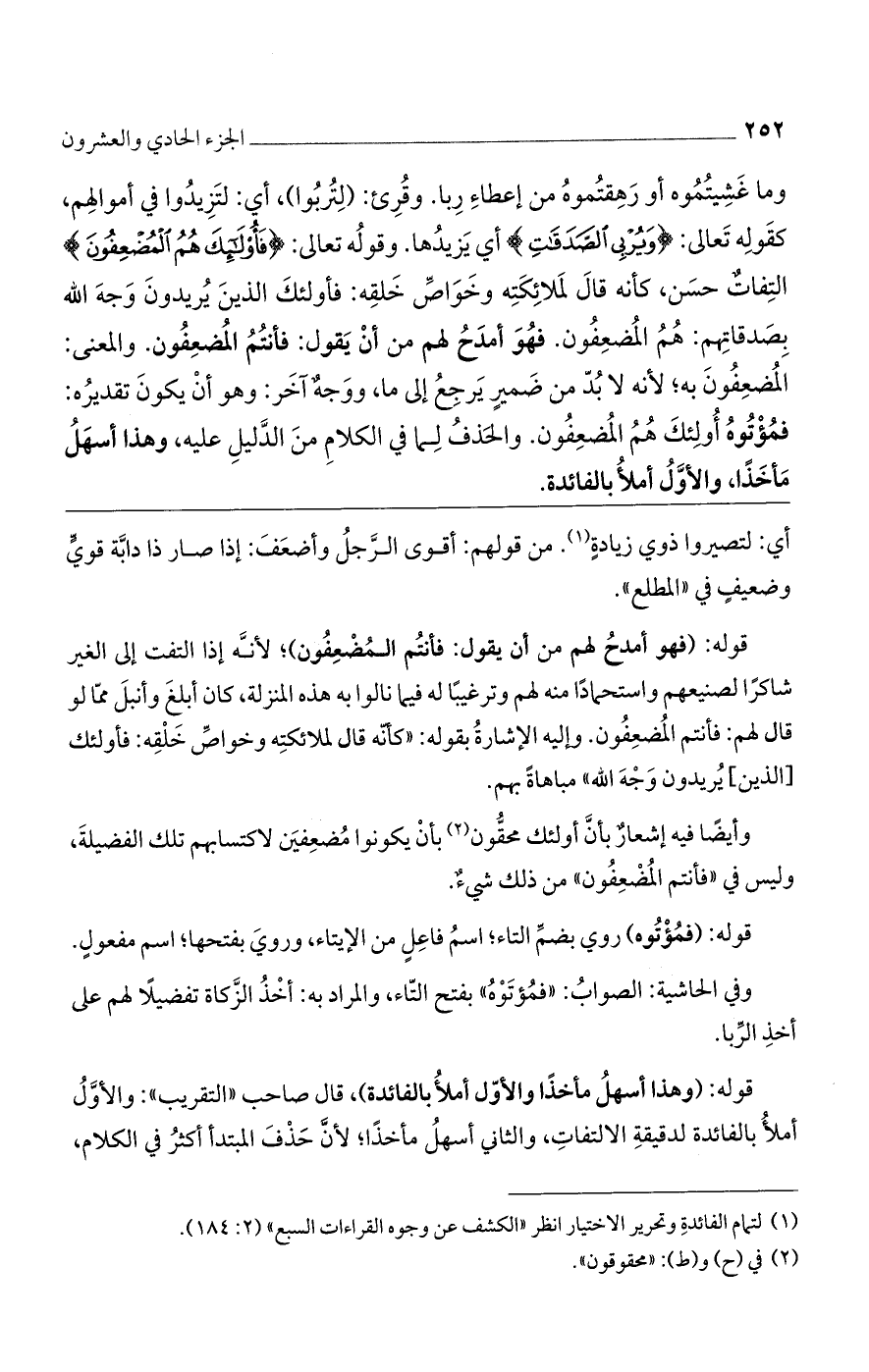 وما غشيتموه أو رهقتموه من إعطاء ربا. وقرئ: (لتربوا)، أى: لتزيدوا في أموالهم، كقوله تعالى: (وَيُرْبِي الصَّدَقاتِ) أى يزيدها. وقوله تعالى: (فَأُولئِكَ هُمُ الْمُضْعِفُونَ) التفات حسن، كأنه قال لملائكته وخواص خلقه: فأولئك الذين يريدون وجه الله بصدقاتهم: هم المضعفون. فهو أمدح لهم من أن يقول: فأنتم المضعفون. والمعنى: المضعفون به؛ لأنه لا بد من ضمير يرجع إلى ما، ووجه آخر: وهو أن يكون تقديره: فمؤتوه أولئك هم المضعفون. والحذف لما في الكلام من الدليل عليه، وهذا أسهل مأخذًا، والأوّل أملأ بالفائدة.