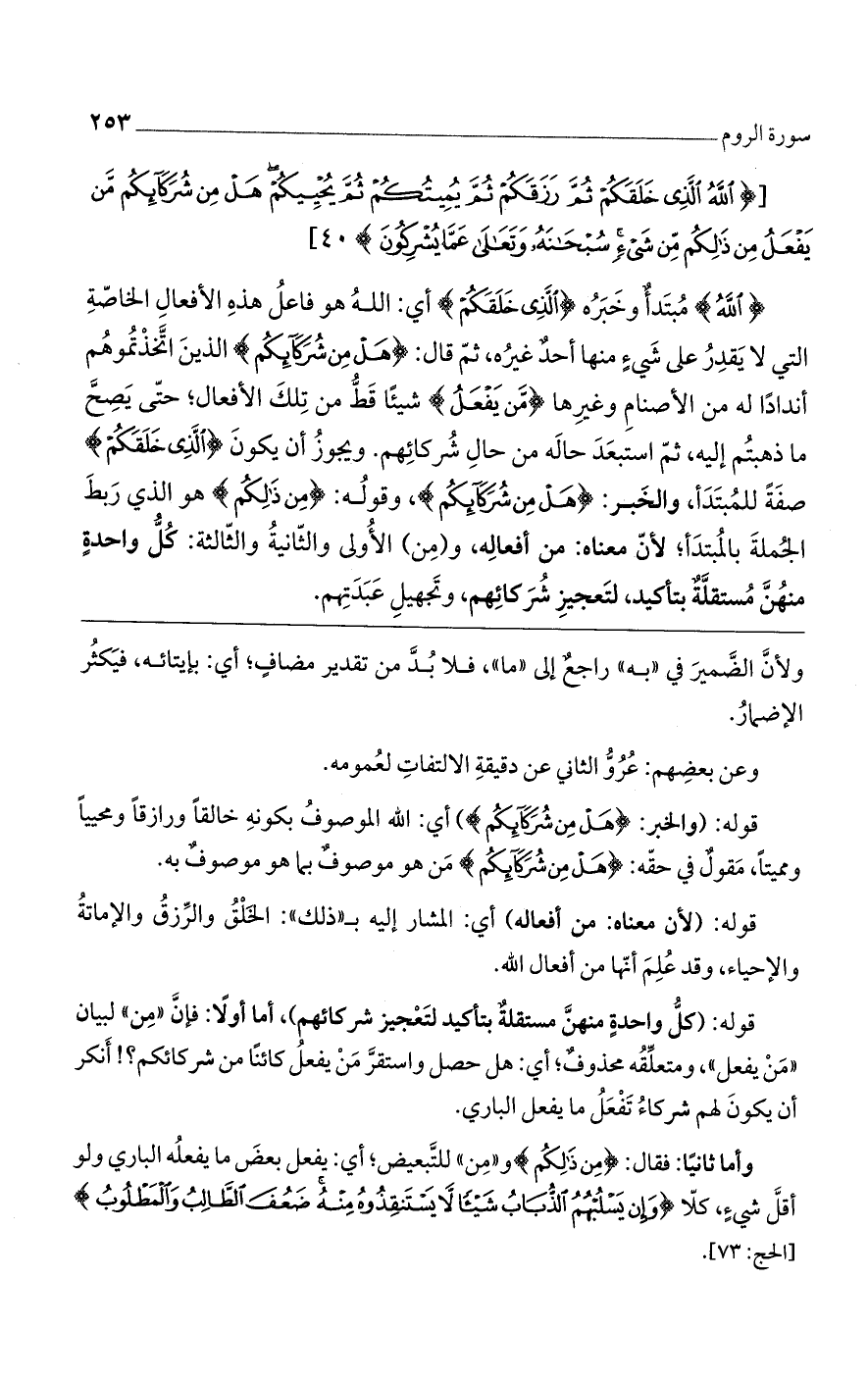 [(الله الَّذِي خَلَقَكُمْ ثُمَّ رَزَقَكُمْ ثُمَّ يُمِيتُكُمْ ثُمَّ يُحْيِيكُمْ هَلْ مِنْ شُرَكائِكُمْ مَنْ يَفْعَلُ مِنْ ذلِكُمْ مِنْ شَيْءٍ سُبْحانَهُ وَتَعالى عَمَّا يُشْرِكُونَ)] 40 [