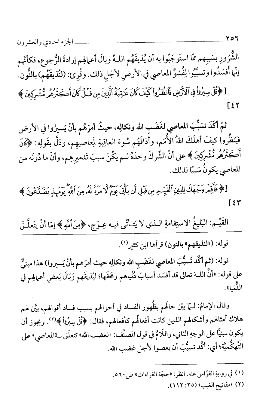 ثم أكد تسبب المعاصي لغضب الله ونكاله، حيث أمرهم بأن يسيروا في الأرض فينظروا كيف أهلك الله الأمم، وأذاقهم سوء العاقبة لمعاصيهم، ودل بقوله: (كانَ أَكْثَرُهُمْ مُشْرِكِينَ) على أنّ الشرك وحده لم يكن سبب تدميرهم، وأنّ ما دونه من المعاصي يكون سببًا لذلك.
