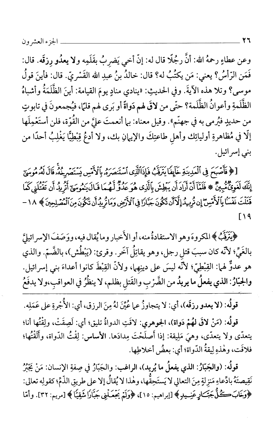 {يَتَرَقَّبُ} المكروهَ وهو الاستقادةُ منه، أو الأخبار وما يُقال فيه، ووَصَفَ الإسرائيليَّ بالغَيِّ؛ لأنّه كان سببَ قتلِ رجل، وهو يقاتِلُ آخَر. وقرئ: (يَبْطُش)، بالضَّمّ. والذي هو عدوٌّ لهما: القِبْطِيّ؛ لأنّه ليسَ على دينِهِما، ولأنّ القِبْطَ كانوا أعداءَ بني إسرائيل.