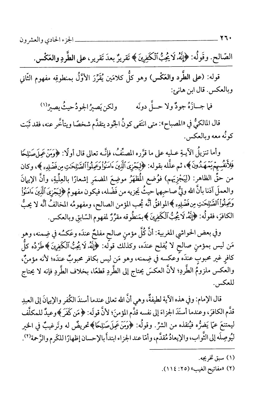 وفي بعض الحواشي المغربية: أنَّ كُلَّ مؤمنٍ صالحٍ مفلحٌ عندَه وعَكسُه في ضِمنه، وهو مَن ليس بمؤمنٍ صالحٍ لا يُفلح عندَه، وكذلك قوله: {إِنَّهُ لَا يُحِبُّ الْكَافِرِينَ} طَرْدُه كلُّ كافرٍ غير محبوبٍ عندَه وعكسه في ضِمنه، وهو مَن ليس بكافر محبوبٌ عندَه؛ لأنه مؤمنٌ، والعكس ملزومُ الطَّردِ؛ لأنَّ العكسَ يحتاج إلى الطَّردِ قطعًا، بخلاف الطَّردِ فإنه لا يحتاج للعكس.