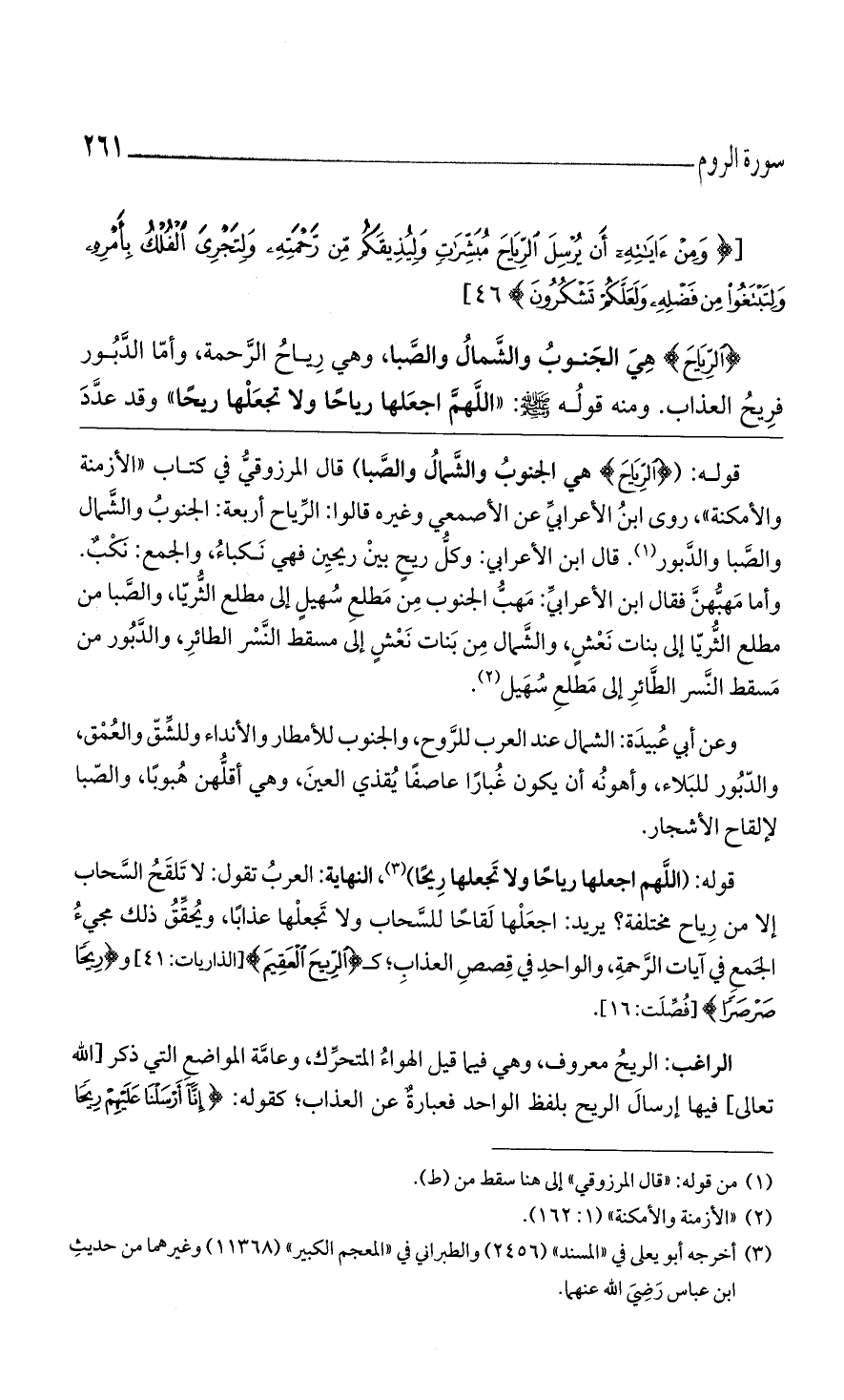 (الرِّياحَ) هي الجنوب والشمال والصبا، وهي رياح الرحمة، وأما الدبور فريح العذاب. ومنه قوله صلى الله عليه وسلم: «اللهمّ اجعلها رياحًا ولا تجعلها ريحًا» وقد عدد