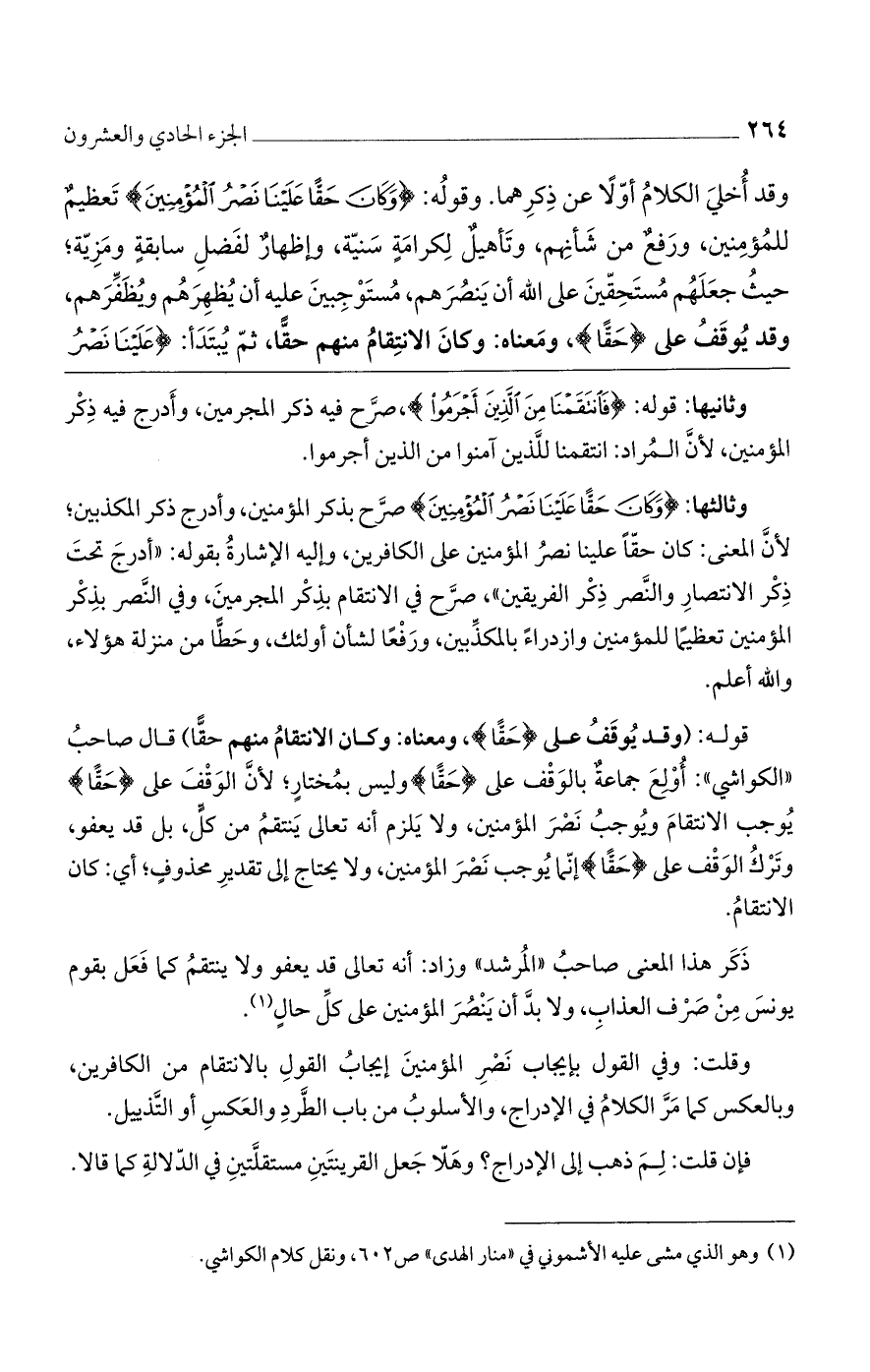 قوله: (وقد يُوقَفُ على {حَقًّا}، ومعناه: وكان الانتقامُ منهم حقًّا) قال صاحبُ ((الكواشي)): أُوْلِعَ جماعةٌ بالوَقْف على {حَقًّا} وليس بمُختارٍ؛ لأنَّ الوَقْفَ على {حَقًّا} يُوجب الانتقامَ ويُوجبُ نَصْرَ المؤمنين، ولا يَلزم أنه تعالى يَنتقمُ من كلٍّ، بل قد يعفو، وتَرْكُ الوَقْف على {حَقًّا} إنّما يُوجب نَصْرَ المؤمنين، ولا يحتاج إلى تقديرِ محذوفٍ؛ أي: كان الانتقامُ.