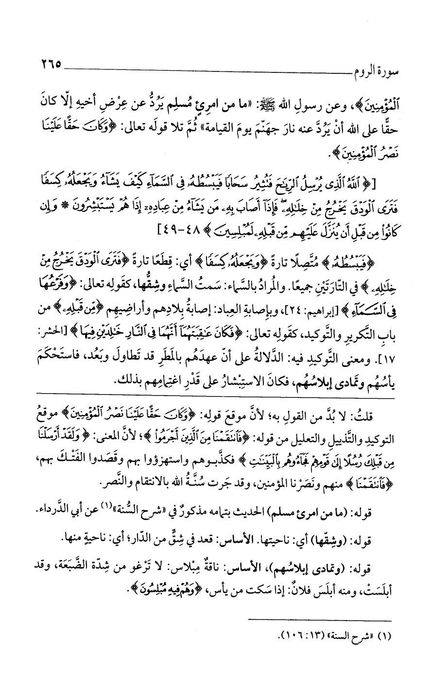 الْمُؤْمِنِينَ)، وعن رسول الله صلى الله عليه وسلم: «ما من امرئ مسلم يردّ عن عرض أخيه إلا كان حقا على الله أن يردّ عنه نار جهنم يوم القيامة» ثم تلا قوله تعالى: (كانَ حَقًّا عَلَيْنا نَصْرُ الْمُؤْمِنِينَ).