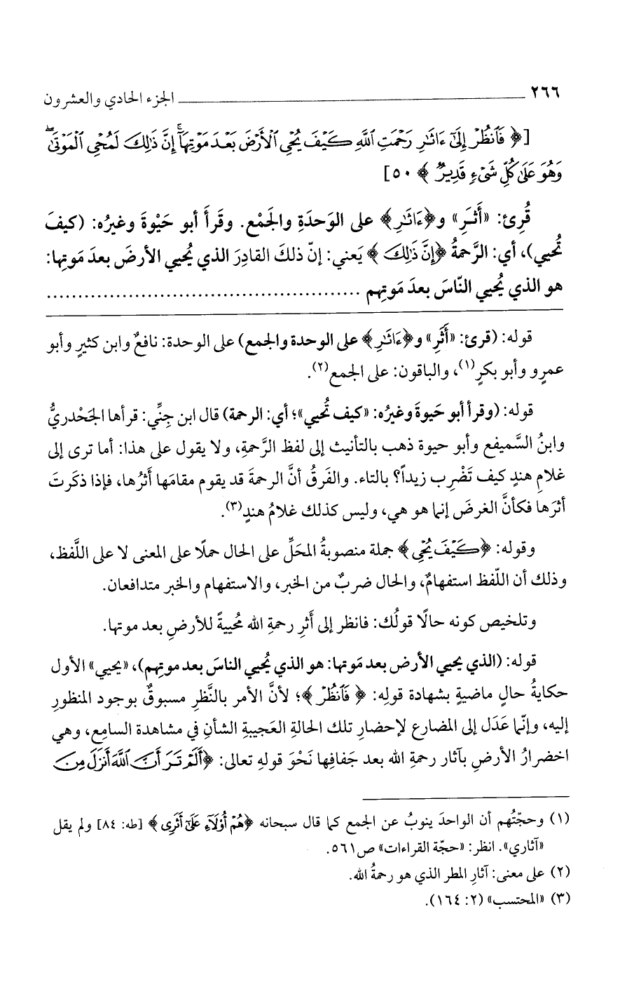 قوله: (قرئ: ((أَثَرِ)) و {آثَارِ} على الوحدة والجمع) على الوحدة: نافعٌ وابن كثيرٍ وأبو عمرٍو وأبو بكرٍ، والباقون: على الجمع.