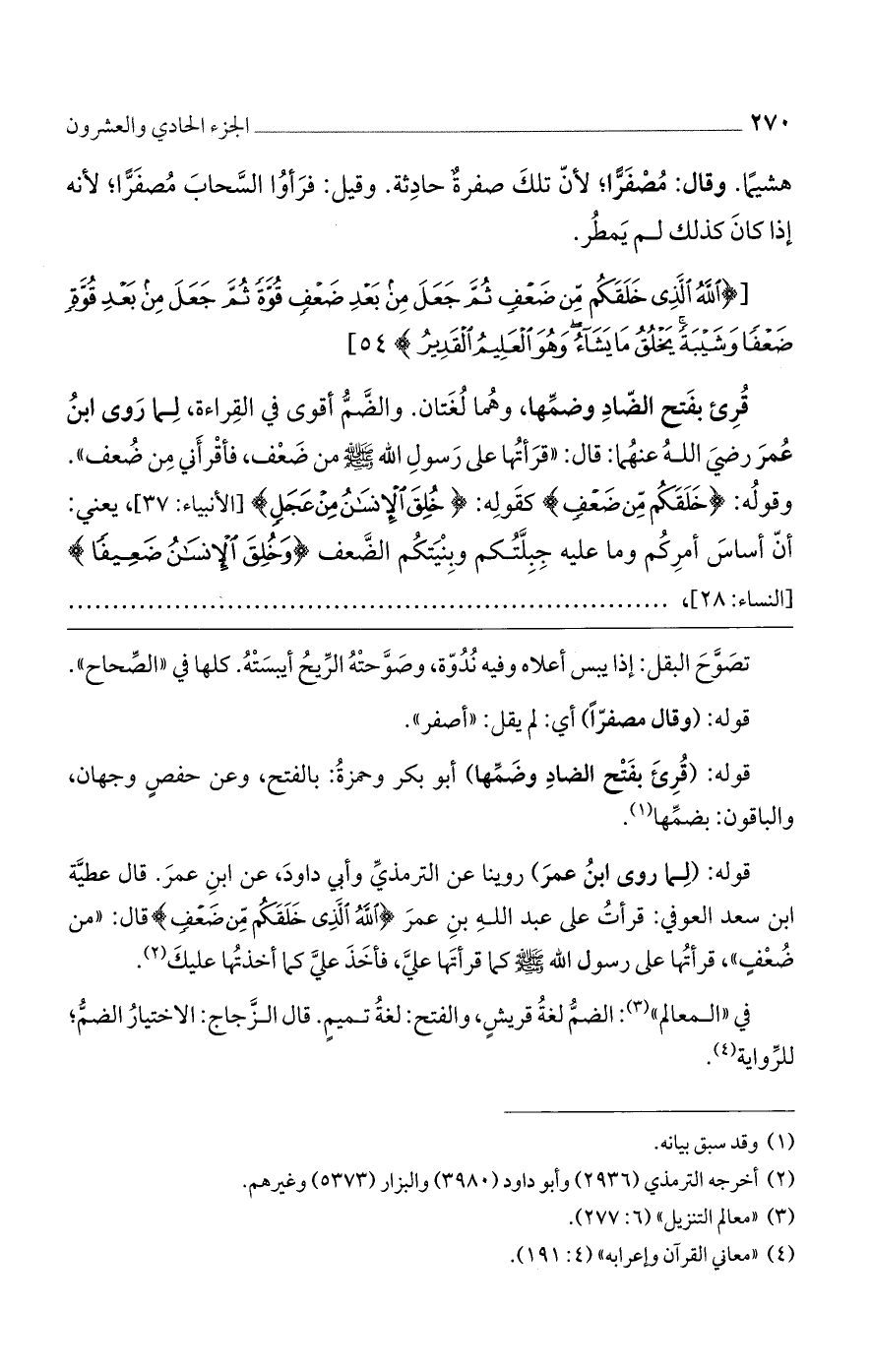 قوله: (لِما روى ابنُ عمرَ) روينا عن الترمذيِّ وأبي داودَ، عن ابنِ عمرَ. قال عطيَّة ابن سعد العوفي: قرأتُ على عبد اللهِ بنِ عمرَ {اللَّهُ الَّذِي خَلَقَكُم مِّن ضَعْفٍ} قال: ((من ضُعْفٍ))، قرأتُها على رسول الله صلى الله عليه وسلم كما قرأتَها عليَّ، فأخَذَ عليَّ كما أخذتُها عليكَ.