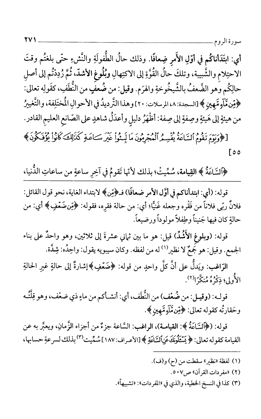 قوله: (أي: ابتدأناكم في أوَّل الأمر ضعافًا) فـ {مِّن} لابتداء الغاية، نحو قول القائل: فلانٌ ربّي فلانًا من فَقْره وجعله غَنيًّا؛ أي: من حالة فقرِه، فقوله: {مِّن ضَعْفٍ} أي: من حالةٍ كان فيها جَنينًا وطِفلاً مولودًا ورضيعًا.