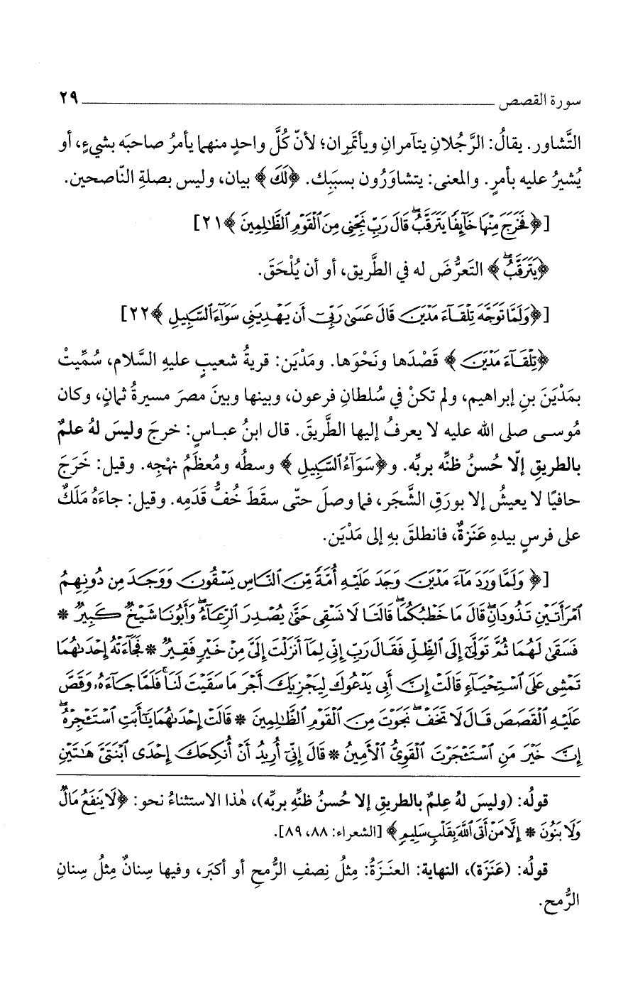 {تِلْقَآءَ مَدْيَنَ} قَصْدَها ونَحْوَها. ومَدْيَن: قريةُ شعيبٍ عليهِ السَّلام، سُمِّيتْ بمَدْيَنَ بنِ إبراهيم، ولم تكنْ في سُلطانِ فرعون، وبينها وبينَ مصرَ مسيرةُ ثمانٍ، وكان مُوسى صلى الله عليه لا يعرفُ إليها الطَّريقَ. قال ابنُ عباسٍ: خرجَ وليسَ لهُ علمٌ بالطريقِ إلاّ حُسنُ ظنِّه بربِّه. {سَوَآءُ اَلْسَّبِيلِ} وسطُه ومُعظَمُ نهْجِه. وقيل: خَرَجَ حافيًا لا يعيشُ إلا بورَقِ الشَّجَر، فما وصلَ حتّى سقَطَ خُفُّ قَدَمِه. وقيل: جاءَهُ مَلَكٌ على فرسٍ بيدهِ عَنَزةٌ، فانطلقَ بهِ إلى مَدْيَن.