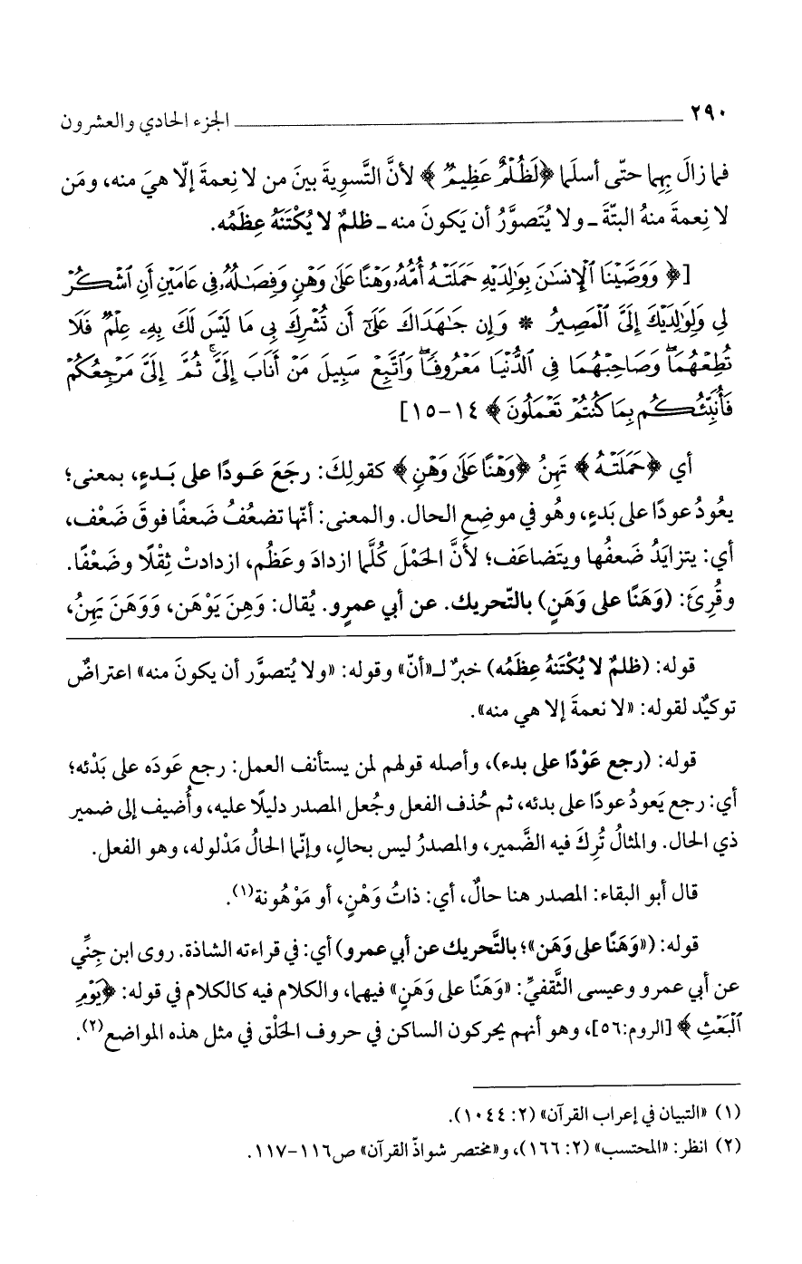 [(وَوَصَّيْنَا الْإِنْسانَ بِوالِدَيْهِ حَمَلَتْهُ أُمُّهُ وَهْناً عَلى وَهْنٍ وَفِصالُهُ فِي عامَيْنِ أَنِ اشْكُرْ لِي وَلِوالِدَيْكَ إِلَيَّ الْمَصِيرُ (14) وَإِنْ جاهَداكَ عَلى أَنْ تُشْرِكَ بِي ما لَيْسَ لَكَ بِهِ عِلْمٌ فَلا تُطِعْهُما وَصاحِبْهُما فِي الدُّنْيا مَعْرُوفاً وَاتَّبِعْ سَبِيلَ مَنْ أَنابَ إِلَيَّ ثُمَّ إِلَيَّ مَرْجِعُكُمْ فَأُنَبِّئُكُمْ بِما كُنْتُمْ تَعْمَلُونَ)] 14 - 15 [