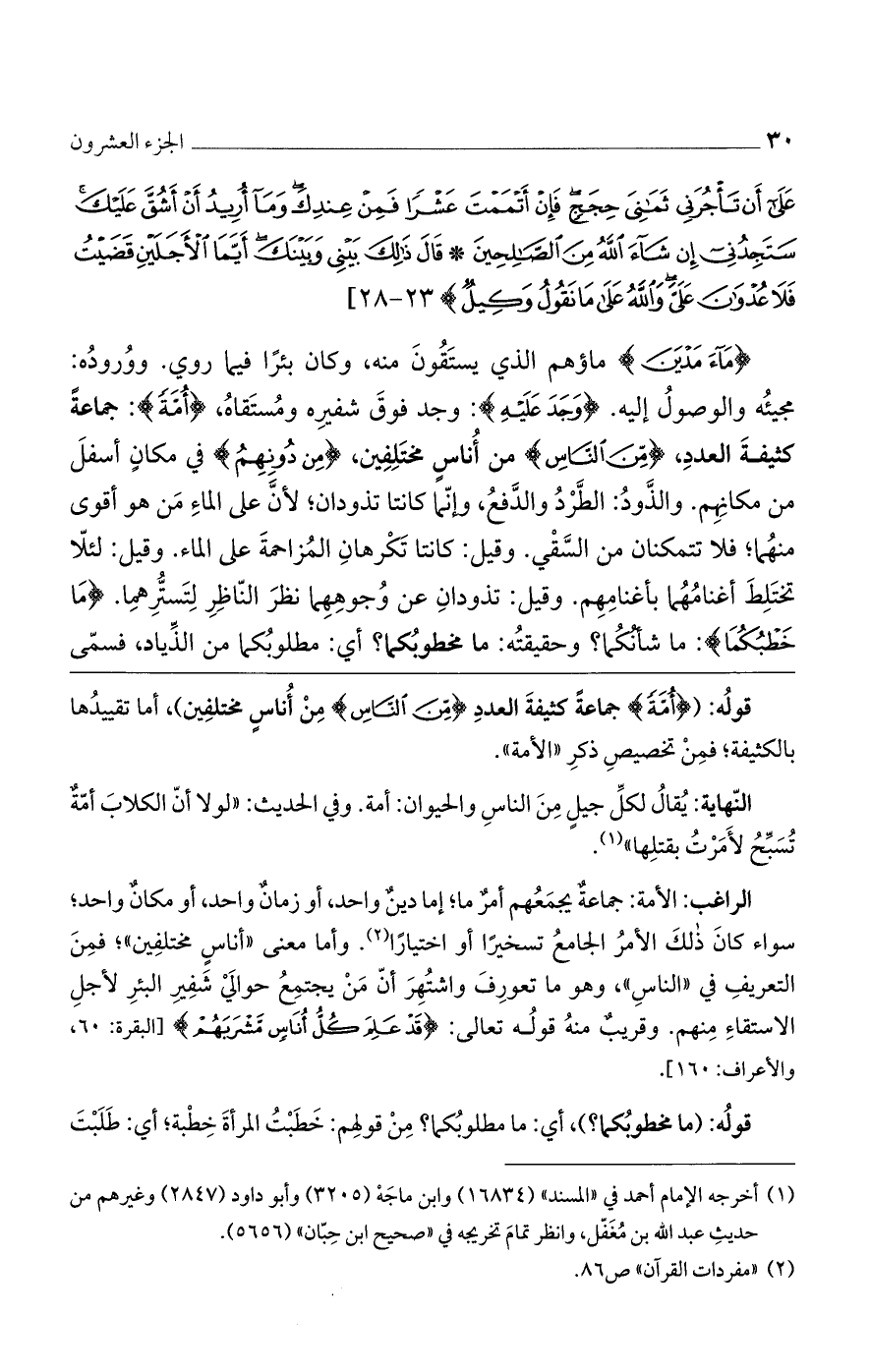 {مَآءَ مَدْيَنَ} ماؤهم الذي يستَقُونَ منه، وكان بئرًا فيما روي. ووُرودُه: مجيئُه والوصولُ إليه. {وَجَدَ عَلَيْهِ}: وجد فوقَ شفيرِه ومُستَقاهُ، {أُمَّةً}: جماعةً كثيفةَ العدد، {مِنَ النَّاسِ} من أُناسٍ مختَلِفِين، {مِن دُونِهِمُ} في مكانٍ أسفلَ من مكانِهِم. والذَّودُ: الطَّرْدُ والدَّفعُ، وإنّما كانتا تذودان؛ لأنَّ على الماءِ مَن هو أقوى منهُما؛ فلا تتمكنان من السَّقْي. وقيل: كانتا تَكْرهانِ المُزاحمةَ على الماء. وقيل: لئلاّ تختَلِطَ أغنامُهُما بأغنامِهِم. وقيل: تذودانِ عن وُجوهِهِما نظرَ النّاظِرِ لِتَستُّرِهِما. {مَا خَطْبُكُمَا}: ما شأنُكُما؟ وحقيقتُه: ما مخطوبُكما؟ أي: مطلوبُكما من الذِّياد، فسمّى