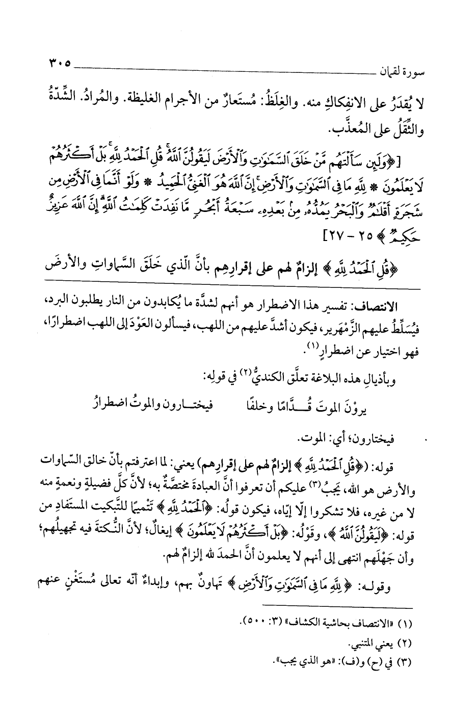[(وَلَئِنْ سَأَلْتَهُمْ مَنْ خَلَقَ السَّماواتِ وَالْأَرْضَ لَيَقُولُنَّ الله قُلِ الْحَمْدُ لِلَّهِ بَلْ أَكْثَرُهُمْ لا يَعْلَمُونَ (25) لِلَّهِ ما فِي السَّماواتِ وَالْأَرْضِ إِنَّ الله هُوَ الْغَنِيُّ الْحَمِيدُ (26) وَلَوْ أَنَّما فِي الْأَرْضِ مِنْ شَجَرَةٍ أَقْلامٌ وَالْبَحْرُ يَمُدُّهُ مِنْ بَعْدِهِ سَبْعَةُ أَبْحُرٍ ما نَفِدَتْ كَلِماتُ الله إِنَّ الله عَزِيزٌ حَكِيمٌ)] 25 - 27 [