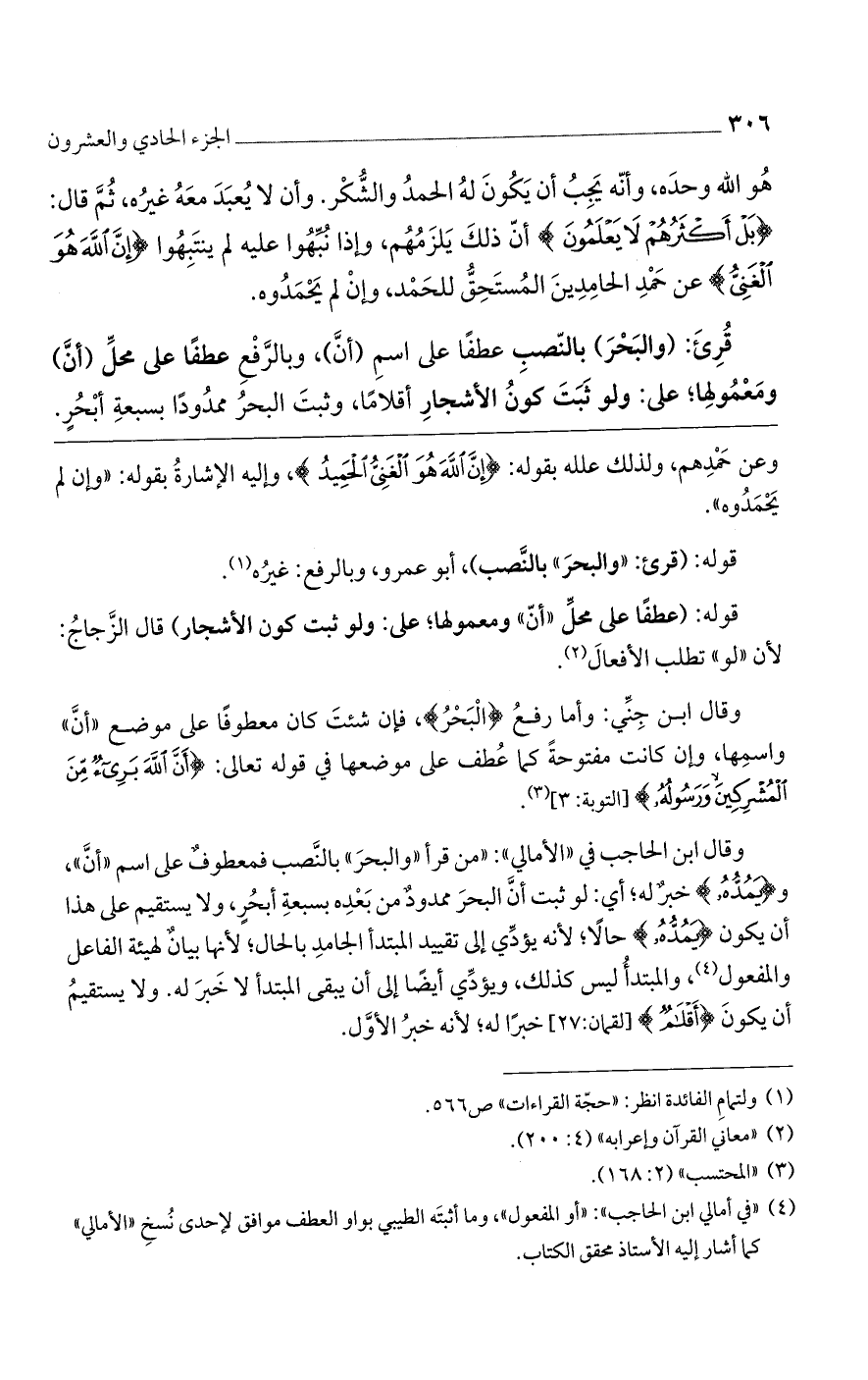 وقال ابن الحاجب في ((الأمالي)): ((من قرأ ((والبحرَ)) بالنَّصب فمعطوفٌ على اسم ((أنَّ))، و {يَمُدُّهُ} خبرٌ له؛ أي: لو ثبت أنَّ البحرَ ممدودٌ من بَعْدِه بسبعةِ أبحُرٍ، ولا يستقيم على هذا أن يكون {يَمُدُّهُ} حالاً؛ لأنه يؤدِّي إلى تقييد المبتدأ الجامدِ بالحال؛ لأنها بيانٌ لهيئة الفاعل والمفعول، والمبتدأُ ليس كذلك، ويؤدِّي أيضًا إلى أن يبقى المبتدأ لا خَبرَ له. ولا يستقيمُ أن يكونَ {أَقْلَامٌ} [لقمان: 27] خبرًا له؛ لأنه خبرُ الأوَّل.