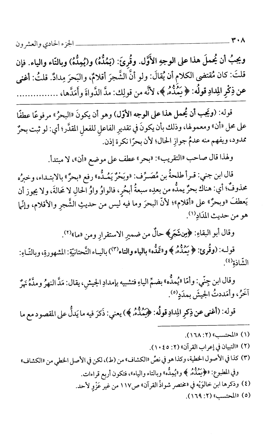 وقال ابن جِنّي: وأمّا ((يُمدُّه)) بضمِّ الياءِ فتشبيه بإمدادِ الجيشِ، يقال: مَدَّ النهرُ ومدَّهُ نَهرٌ آخَرُ، وأمَدذتُ الجيشَ بمدَدٍ.