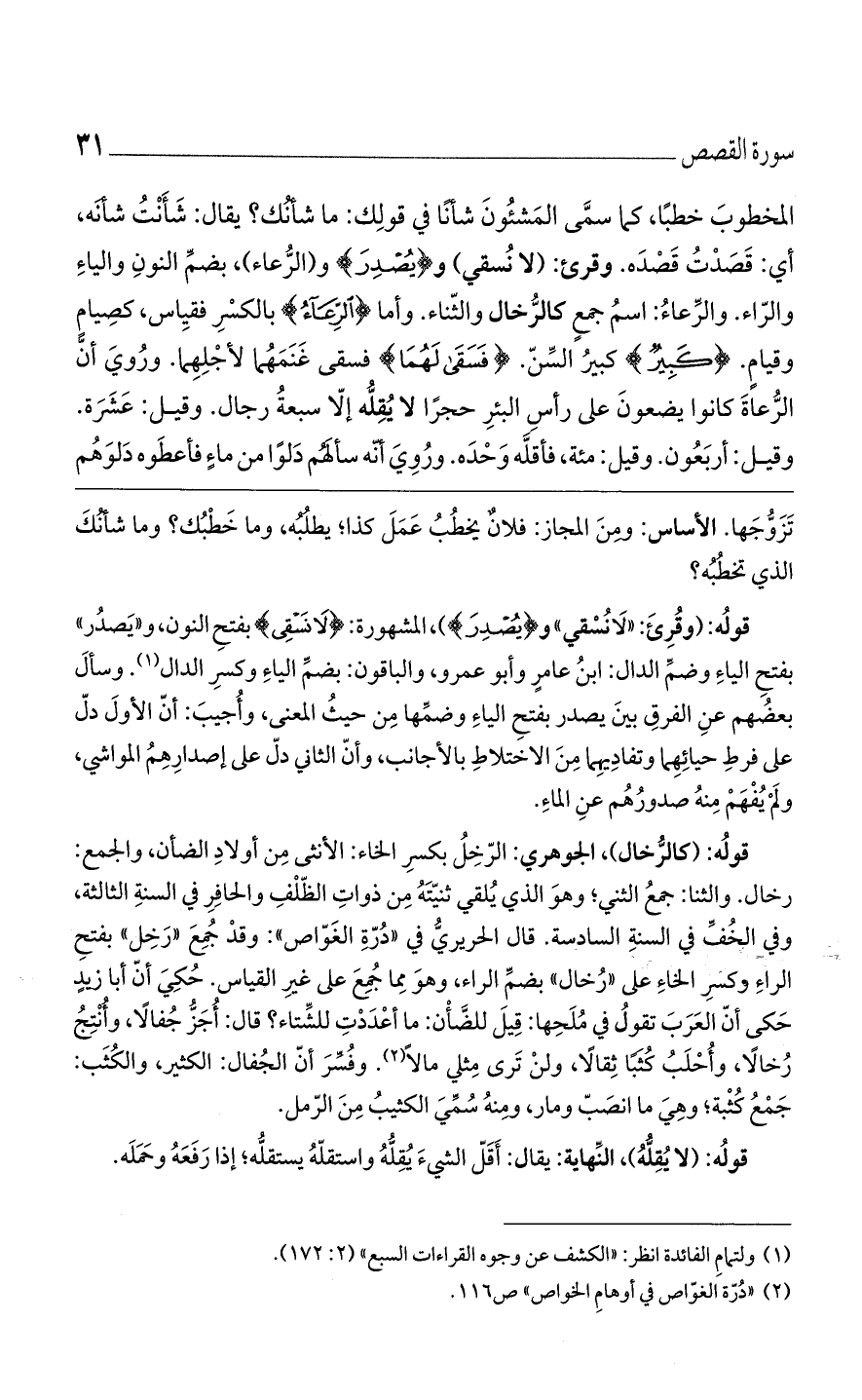 قولُه: (وقُرِئَ: ((لاَ نُسْقي)) و {يُصْدِرَ})، المشهورة: {لاَ نَسْقِي} بفتحِ النون، و ((يَصدُر)) بفتحِ الياءِ وضمَّ الدال: ابنُ عامرٍ وأبو عمرو، والباقون: بضمِّ الياءِ وكسرِ الدال. وسألَ بعضُهم عنِ الفرقِ بينَ يصدر بفتحِ الياءِ وضمِّها مِن حيثُ المعنى، وأُجيبَ: أنّ الأولَ دلّ على فرطِ حيائِهِما وتفادِيهِما مِنَ الاختلاطِ بالأجانب، وأنّ الثاني دلّ على إصدارِهِمُ المواشي، ولَمْ يُفْهَمْ مِنهُ صدورُهُم عنِ الماءِ.