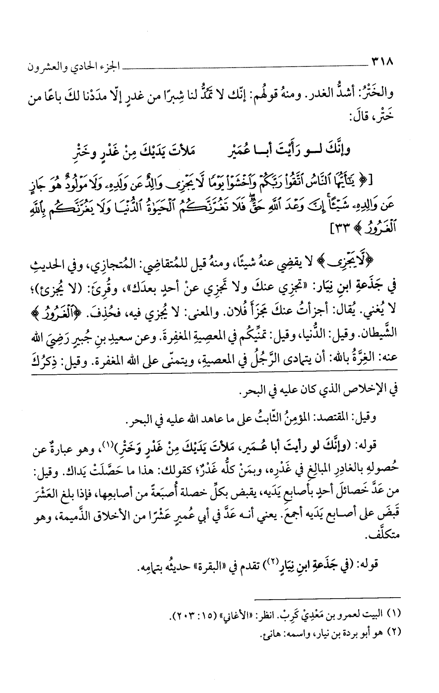 [يا أَيُّهَا النَّاسُ اتَّقُوا رَبَّكُمْ وَاخْشَوْا يَوْماً لا يَجْزِي والِدٌ عَنْ وَلَدِهِ وَلا مَوْلُودٌ هُوَ جازٍ عَنْ والِدِهِ شَيْئاً إِنَّ وَعْدَ الله حَقٌّ فَلا تَغُرَّنَّكُمُ الْحَياةُ الدُّنْيا وَلا يَغُرَّنَّكُمْ بِالله الْغَرُورُ)] 33 [
