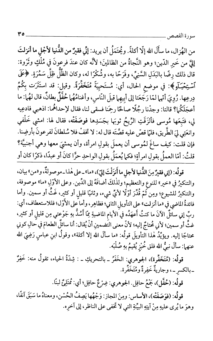 من الهُزال، ما سأَل الله إلاّ أكلةً. ويُحتَمَلُ أن يريد: إنِّي فقيرٌ من الدُّنيا لأجْلِ ما أنزلتَ إليَّ من خَيرِ الدّين؛ وهو النَّجاةُ من الظالمينَ؛ لأنَّه كان عندَ فرعونَ في مُلْكٍ وثَرْوة: قال ذلك رِضًا بالبَدَلِ السَّنِيِّ، وفَرَحًا به، وشُكْرًا له، وكان الظِّلُّ ظِلَّ سَمُرَةٍ. {عَلَى اسْتِحْيَآءٍ}: في موضعِ الحال، أي: مُستَحيِيَةً مُتَخَفِّرَةً. وقيل: قد استَتَرَت بِكُمِّ دِرعِها. رُوِيَ أنّهما رَجَعَتا إلى أبِيهٍما قبلَ النّاسِ، وأغنامُهُما حُفَّلٌ بطانٌ، قال لهُما: ما أعجَلَكُما؟ قالتا: وجدْنا رجُلاً صالحًا رحِمَنا فسقى لنا، فقال لإحداهُما: اذهبي فادعِيه لي، فتَبِعَها مُوسى فألزَقَتِ الرِّيحُ ثوبَها بجَسَدِها فوصَفَتْه، فقال لها: امشي خَلْفي وانعَتِي ليَ الطَّريق، فلّما قصّ عليه قصَّتَه قال له: لا تخفْ فلا سُلطانَ لفرعونَ بأرضِنا.